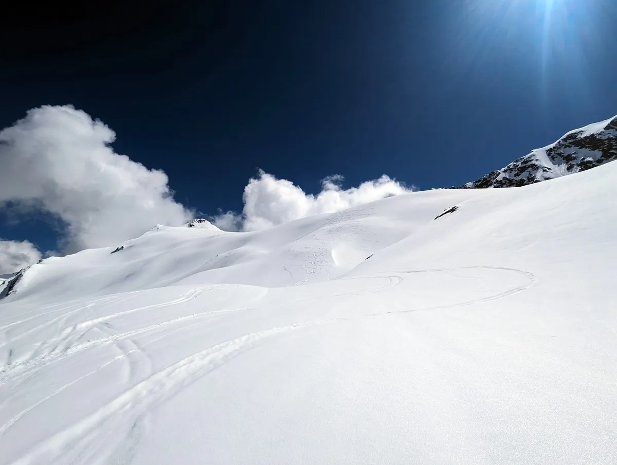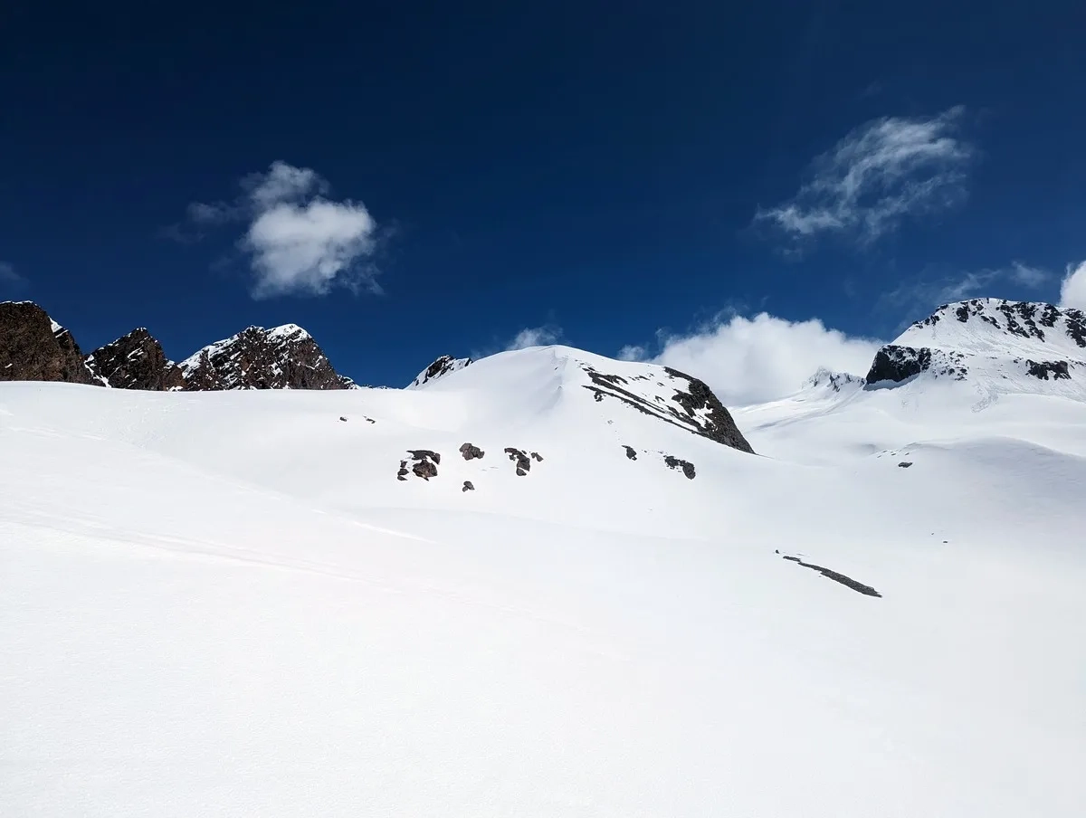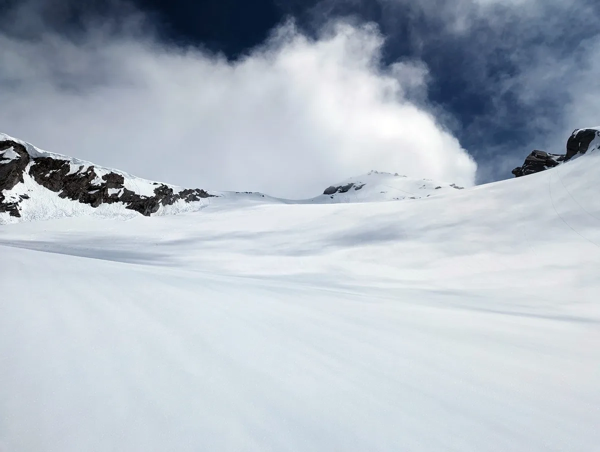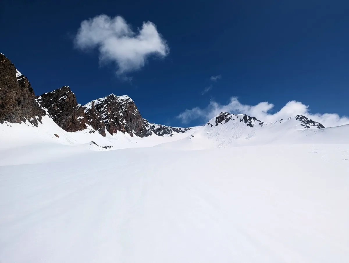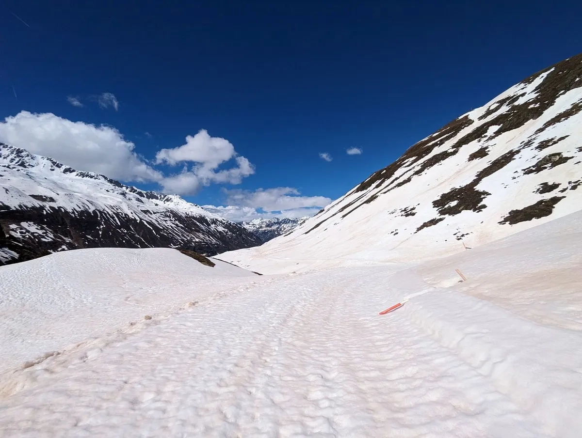 In der Abfahrt vom Wasserfallferner nicht zu weit rechts halten (steile Felswände).