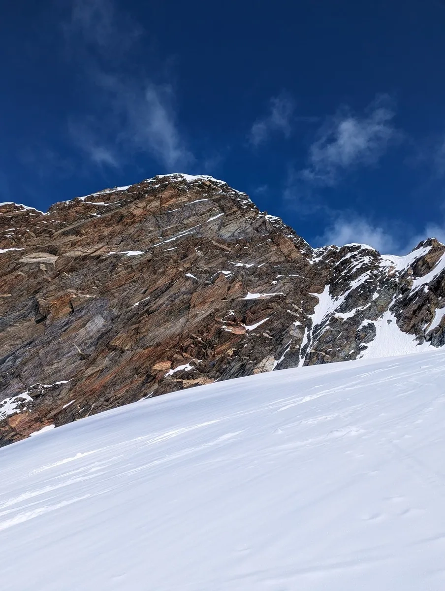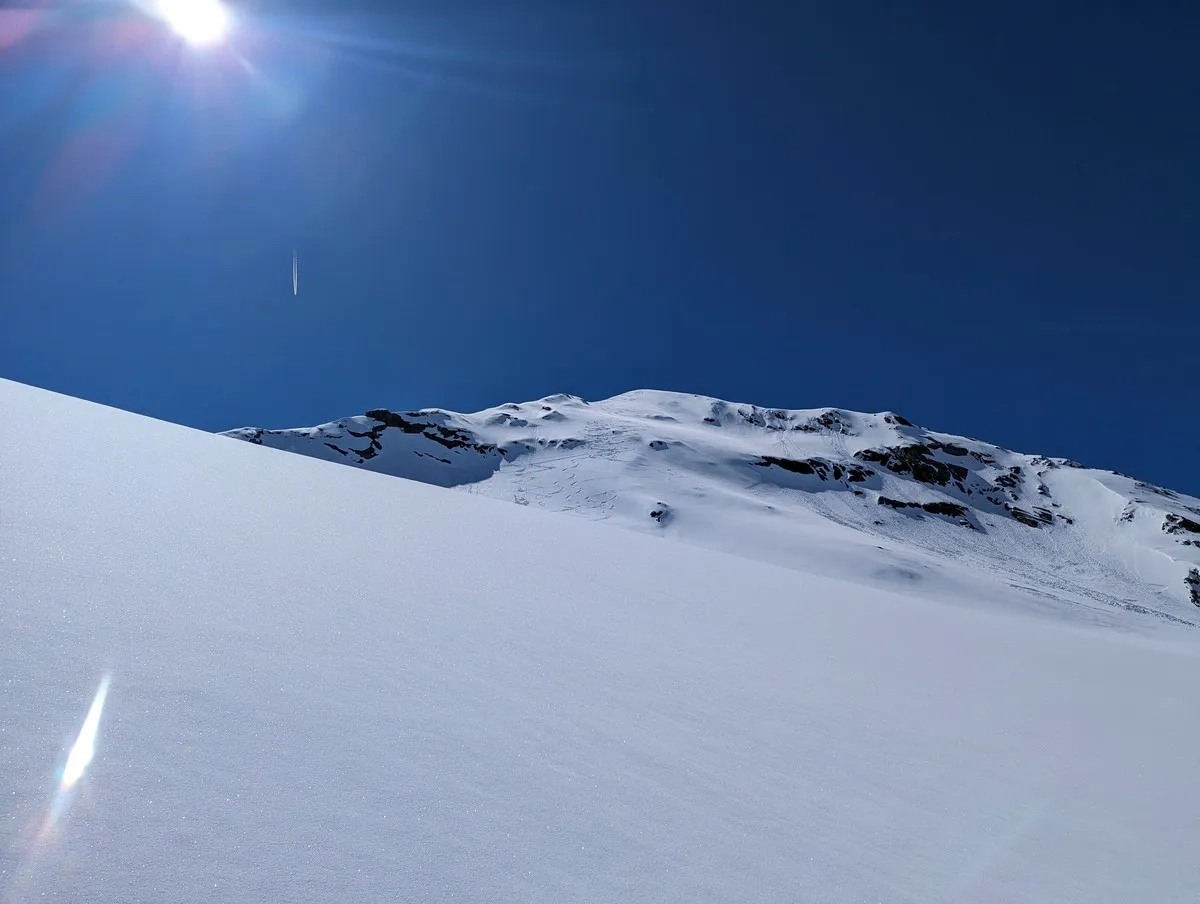 - Etwa 250 Höhenmeter unter dem Gipfel beginnt der steile Gipfelhang. Bei sicherer Schneelage kann über diesen mit den Skiern bis zum Gipfel aufgestiegen werden. Alternativ ist auch ein Aufstieg über den Grat zwischen Seelenferner und Wasserfallferner möglich (aber mühsamer).