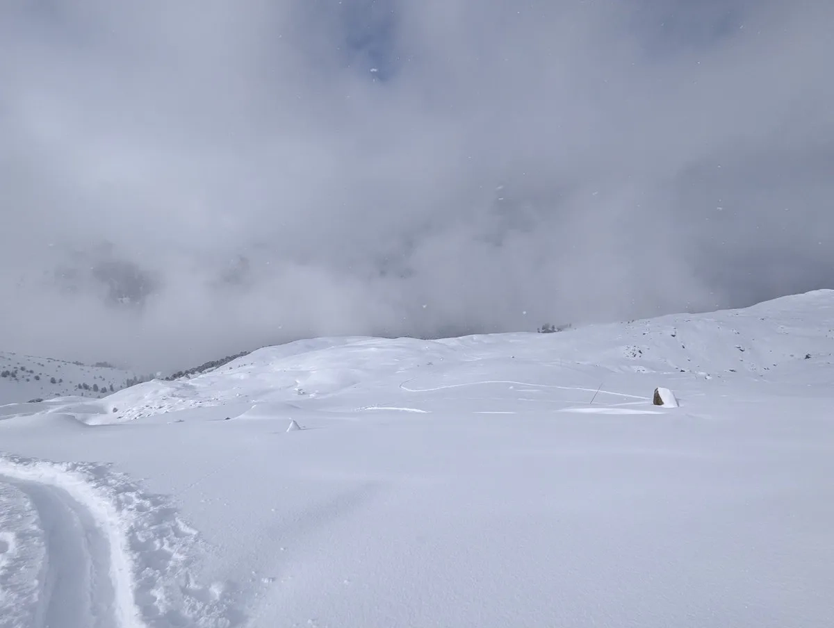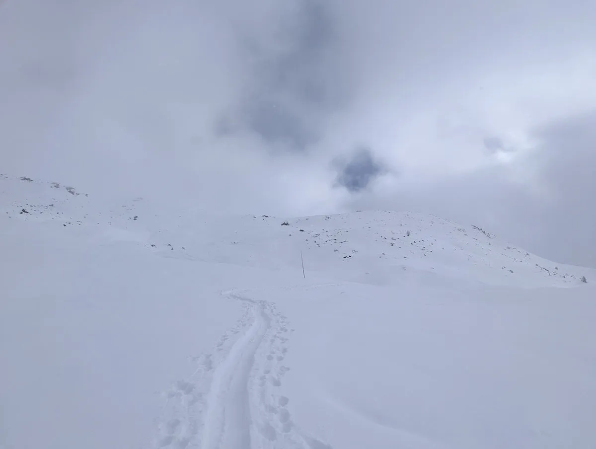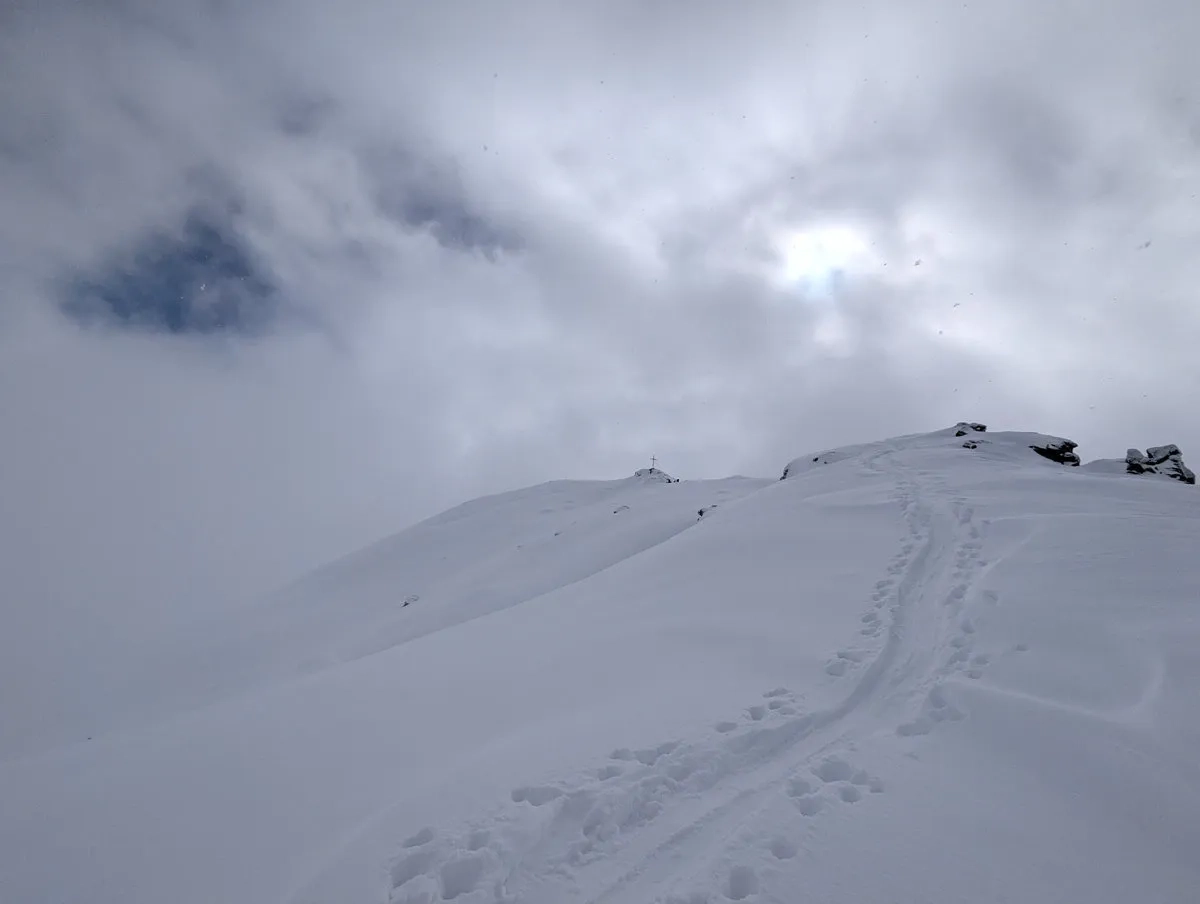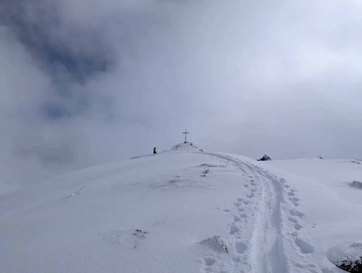 - Gipfelglück: Die letzten Meter spaziert man am breiten Gipfelkamm entlang bis zum Gipfel. Bei guter Schneelage kann man mit den Skiern bis zum Gipfelkreuz gehen und dort das obligatorische Gipfel-Selfie schießen.