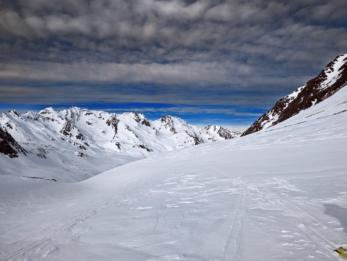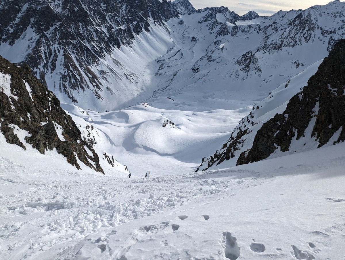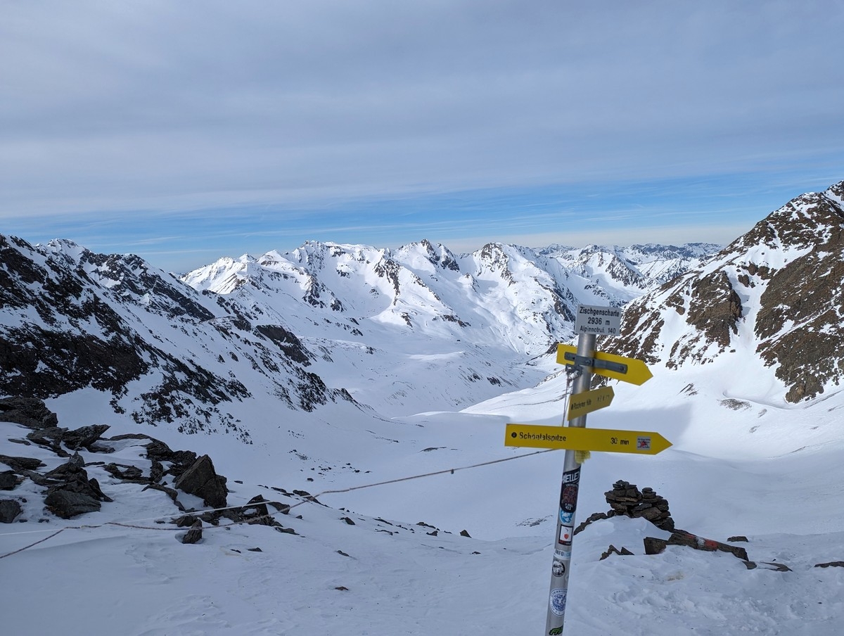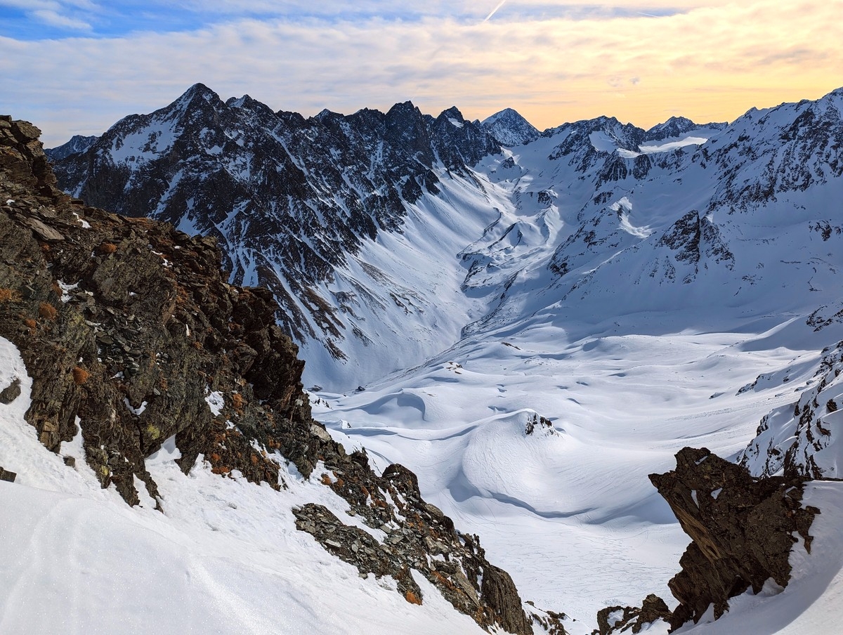 Skitour Schöntalspitze 24: Die Zischgenscharte mit dem Gleirschtal.