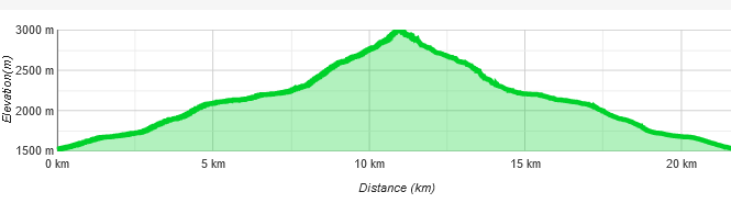 Vom Tal bis zum Gipfel sind es rund 1.500 Höhenmeter. Der sehr lange und flache Aufstieg ist aber durchaus konditionell fordernd. Mit Abfahrt werden so in Summe rund 22 Kilometer zurückgelegt.