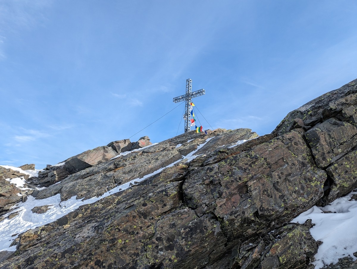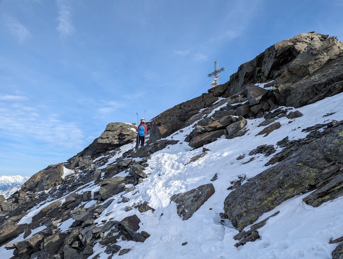 Skitour Schöntalspitze 09: Blick auf das Gipfelkreuz. Rechts darunter über eine kleine Rinne der Aufstieg.