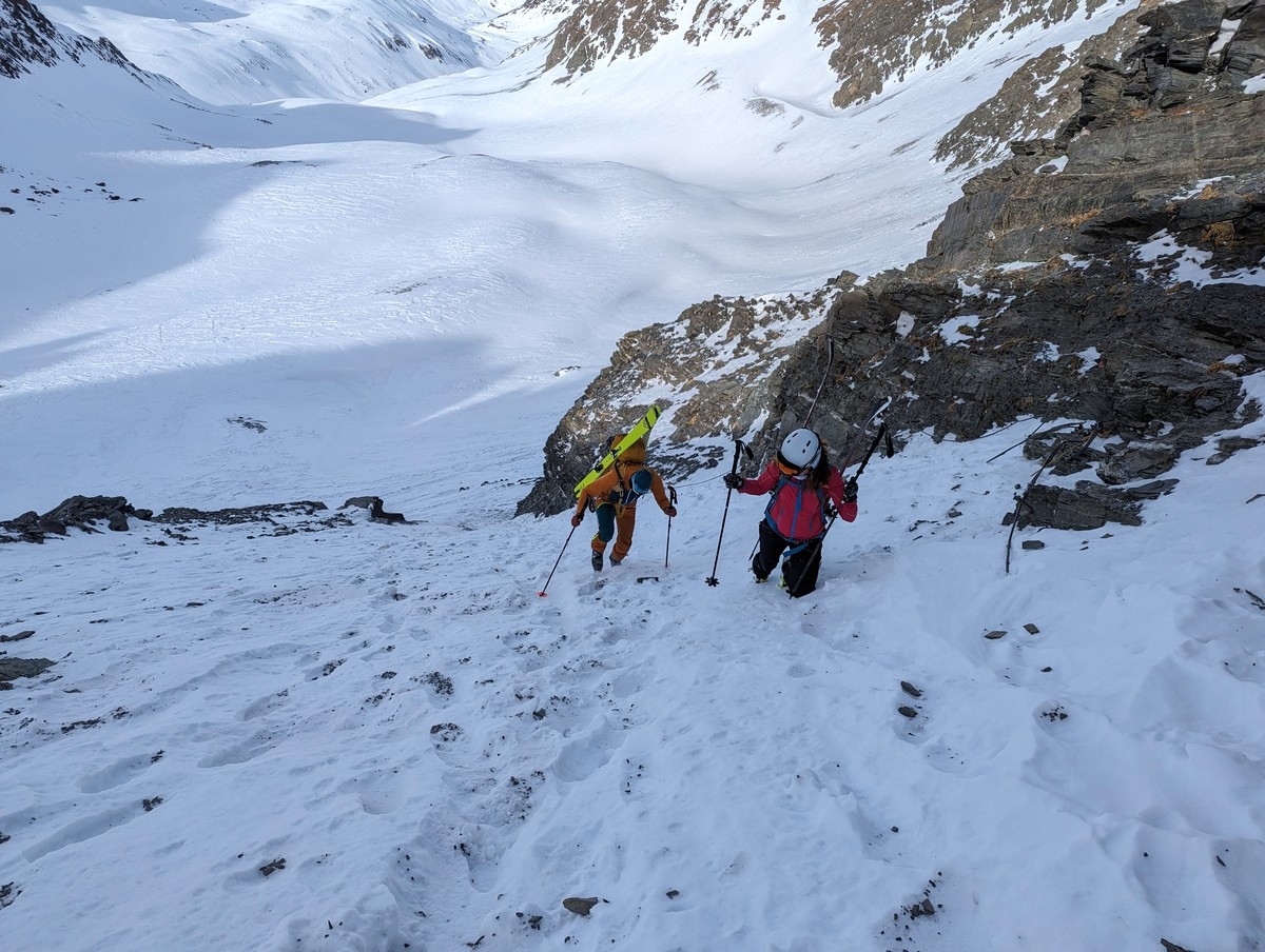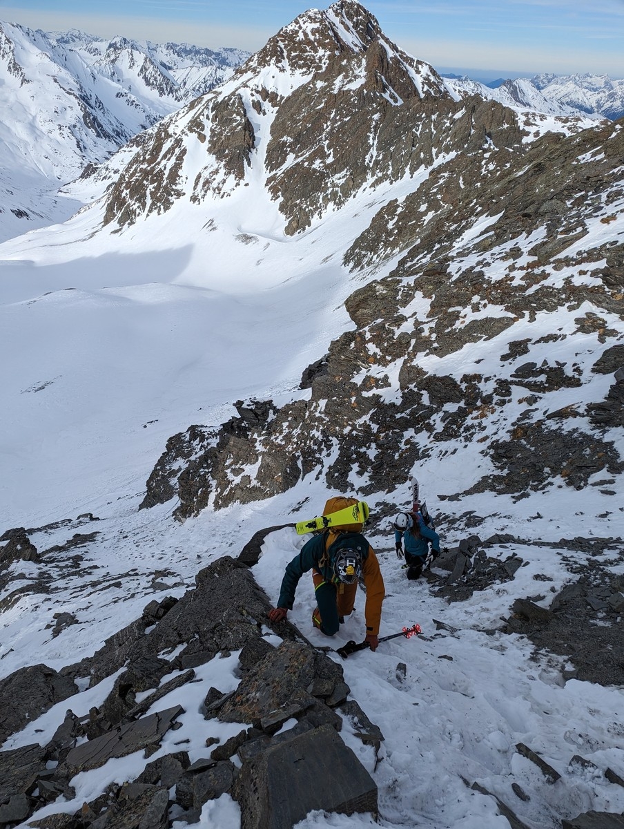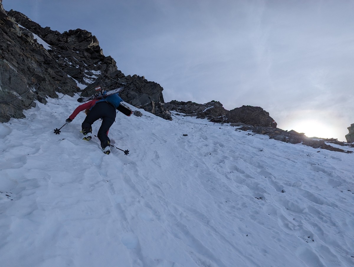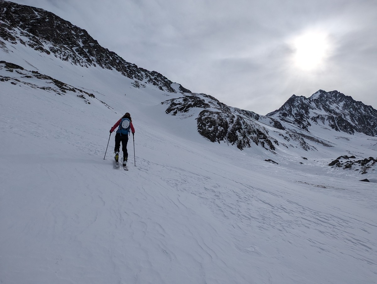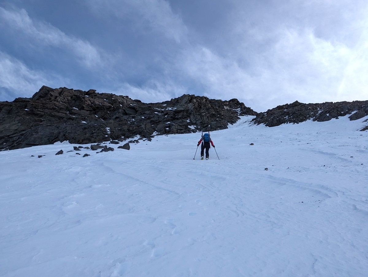Skitour Schöntalspitze 11: Kurz vor der Rinne schnallen wir bereits die Ski ab. Zu eisig ist es hier. Bei mehr Schnee kann man wahrscheinlich deutlich höher mit den Skiern aufsteigen.