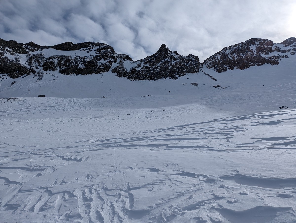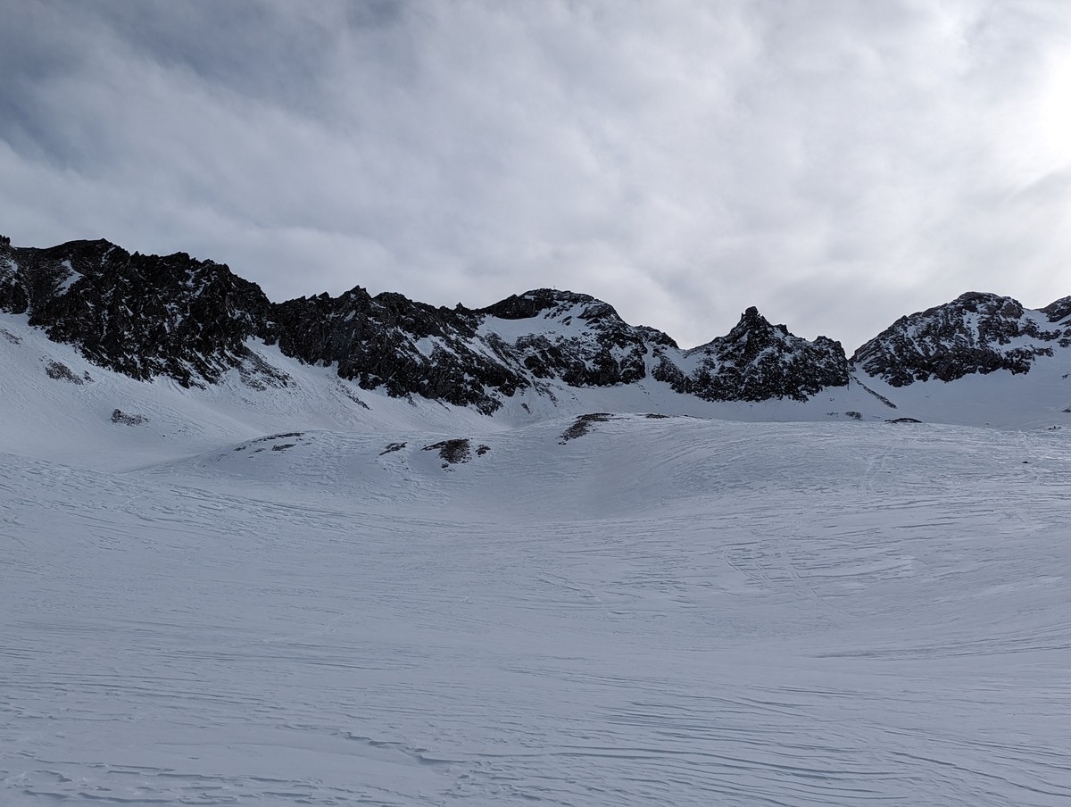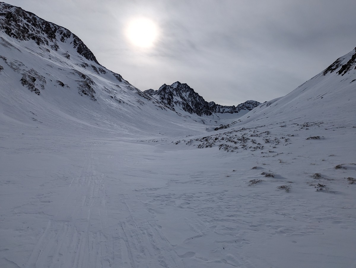 Skitour Schöntalspitze 23: Blick von der Zischgenscharte auf die Route über das Schöntal. Es ist der Standard-Skitourenweg auf die Schöntalspitze.