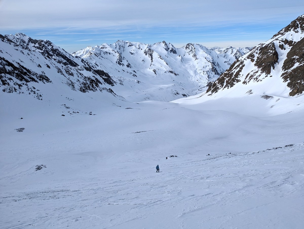 Skitour Schöntalspitze 25: Abfahrt. Kurz nach dem Steilhang bis zum Startpunkt durchgehend flach.