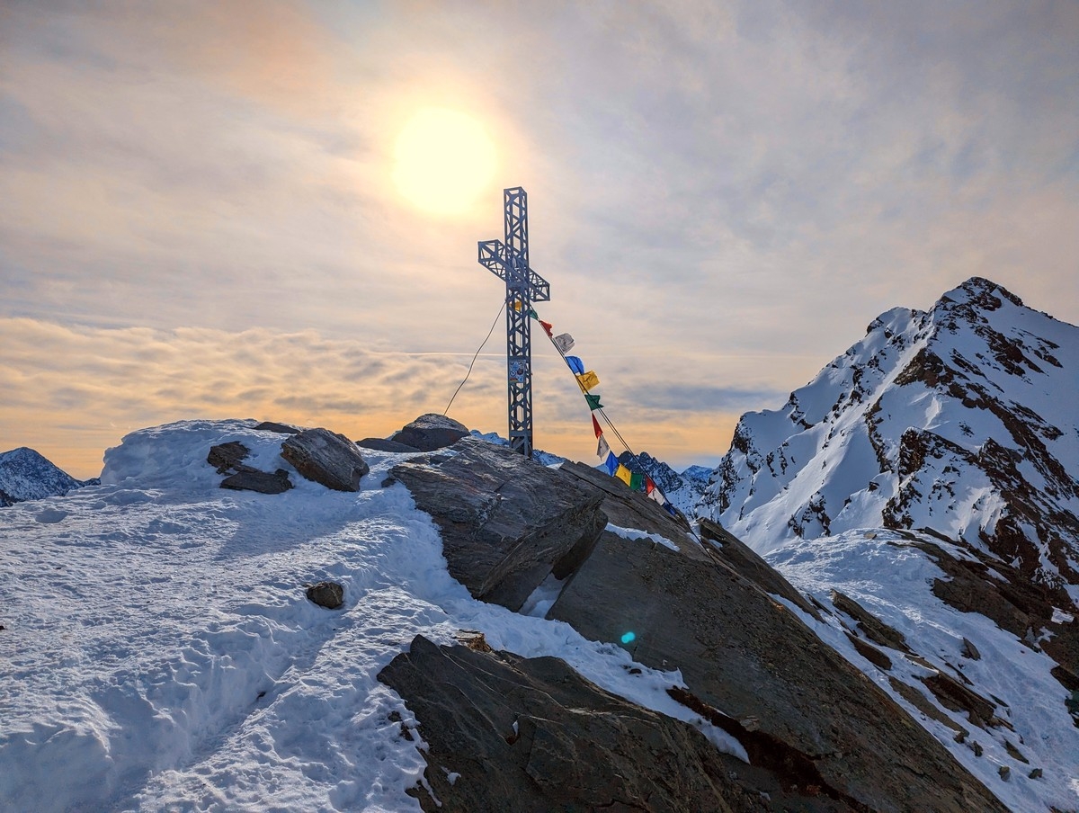 Skitour Schöntalspitze 10: Die Rinne befindet sich direkt rechts unter dem Gipfelkreuz. Deutlich weiter rechts gäbe es noch eine weitere Scharte. Über diese ist der Gipfel aber nahezu unerreichbar.
