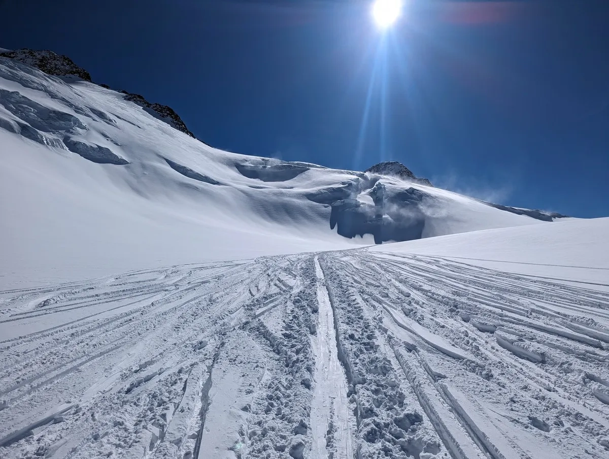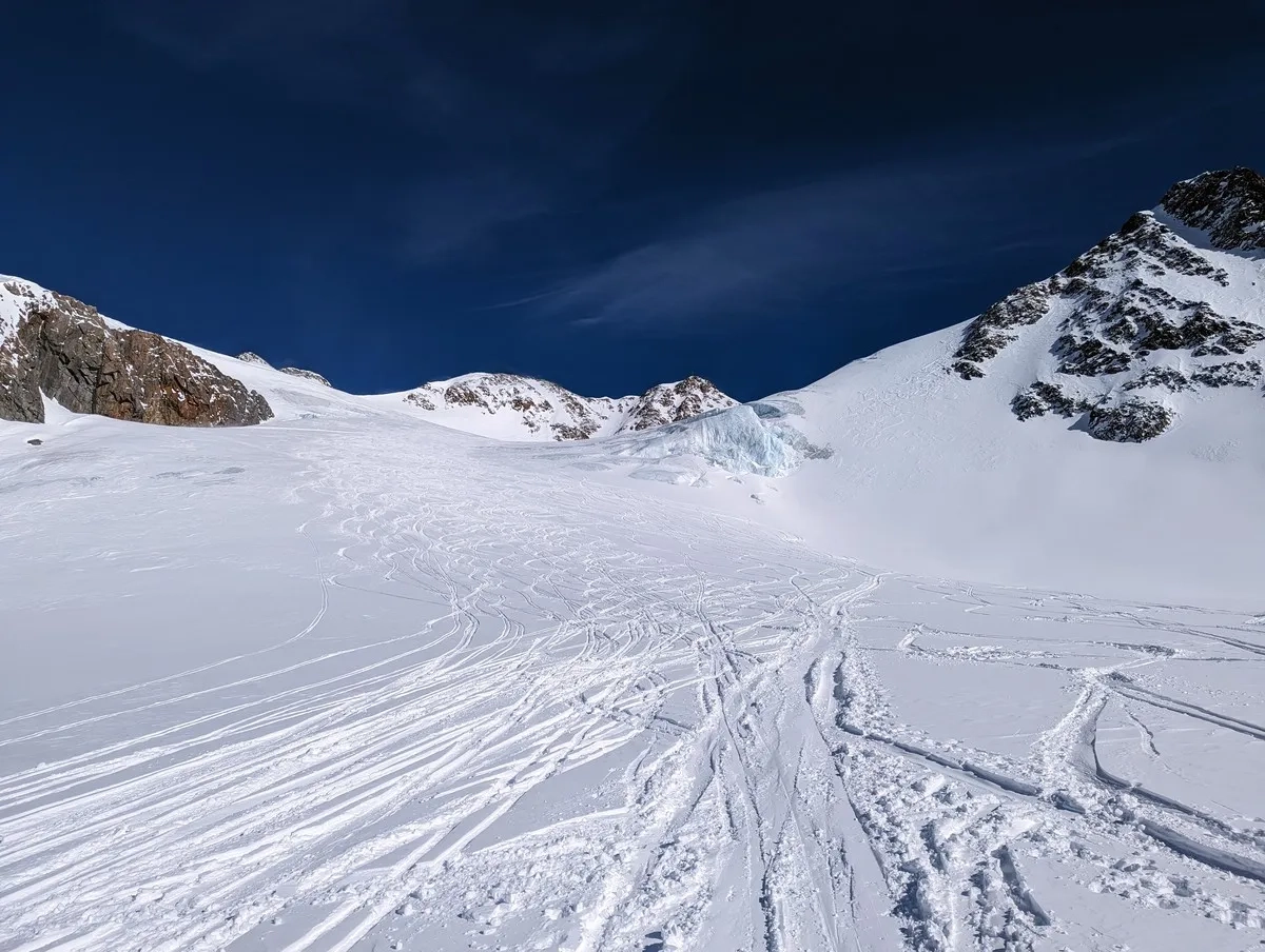 • Nun aber weiterhin am Ferner bleiben und Richtung Westen abfahren. Dabei immer mittig am Gletscher halten.