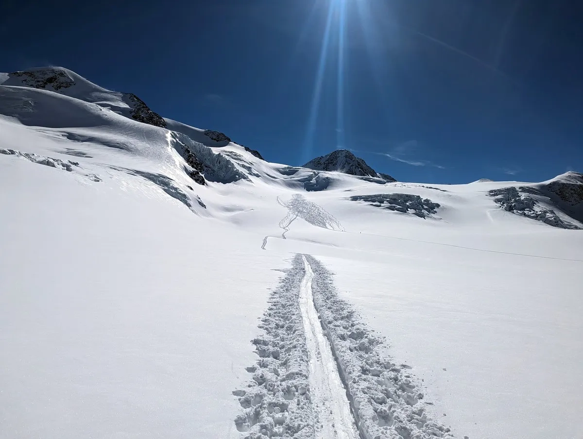 Obwohl man sich lange Zeit am Gletscher aufhält, sind fast alle Skitourengeher ohne Seil bzw. Gletscherausrüstung aktiv, da die Route ohnehin einer gespurten Autobahn gleicht.