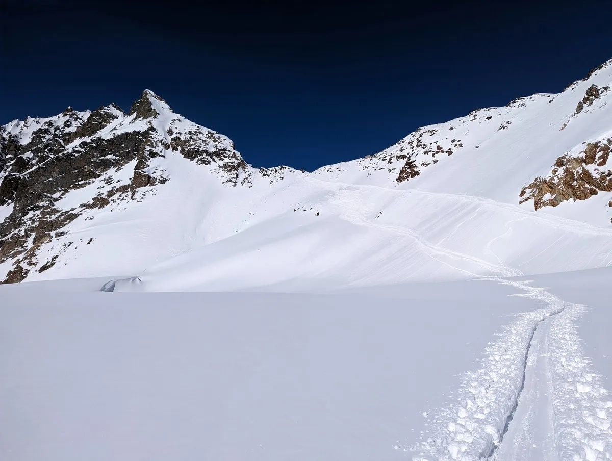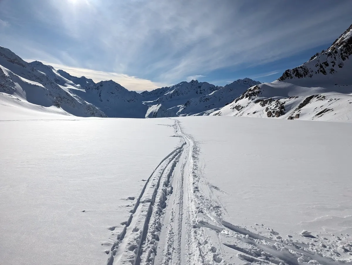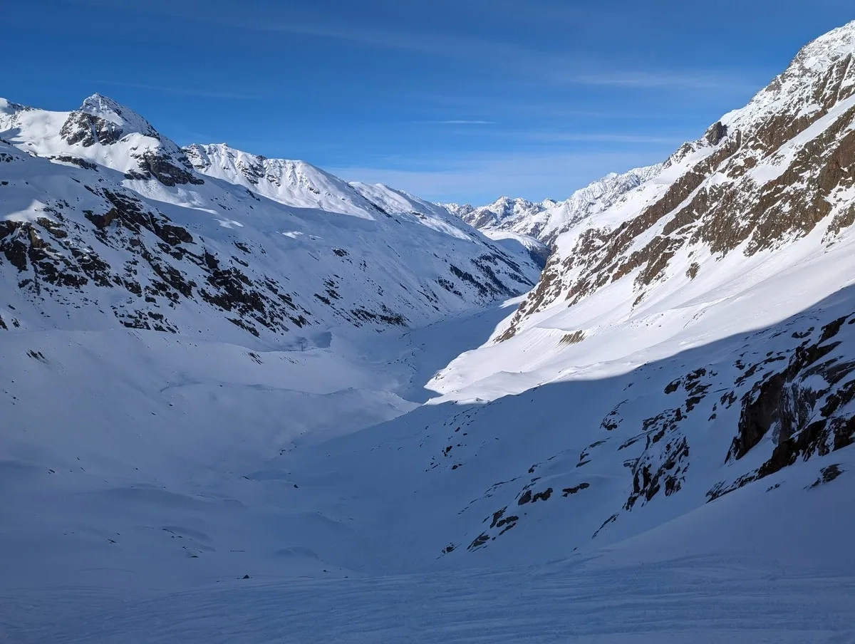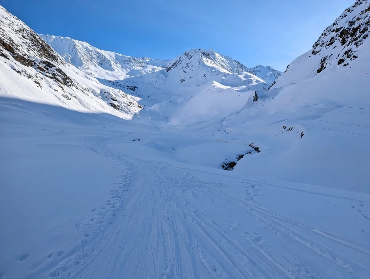 Die tageszeitliche Erwärmung sollte allerdings berücksichtigt werden. Ich startete erst am Nachmittag um 14:15 Uhr beim Mittelbergjoch, hatte aber aufgrund der guten Schneesituation keine Sorge wegen Lawinen.