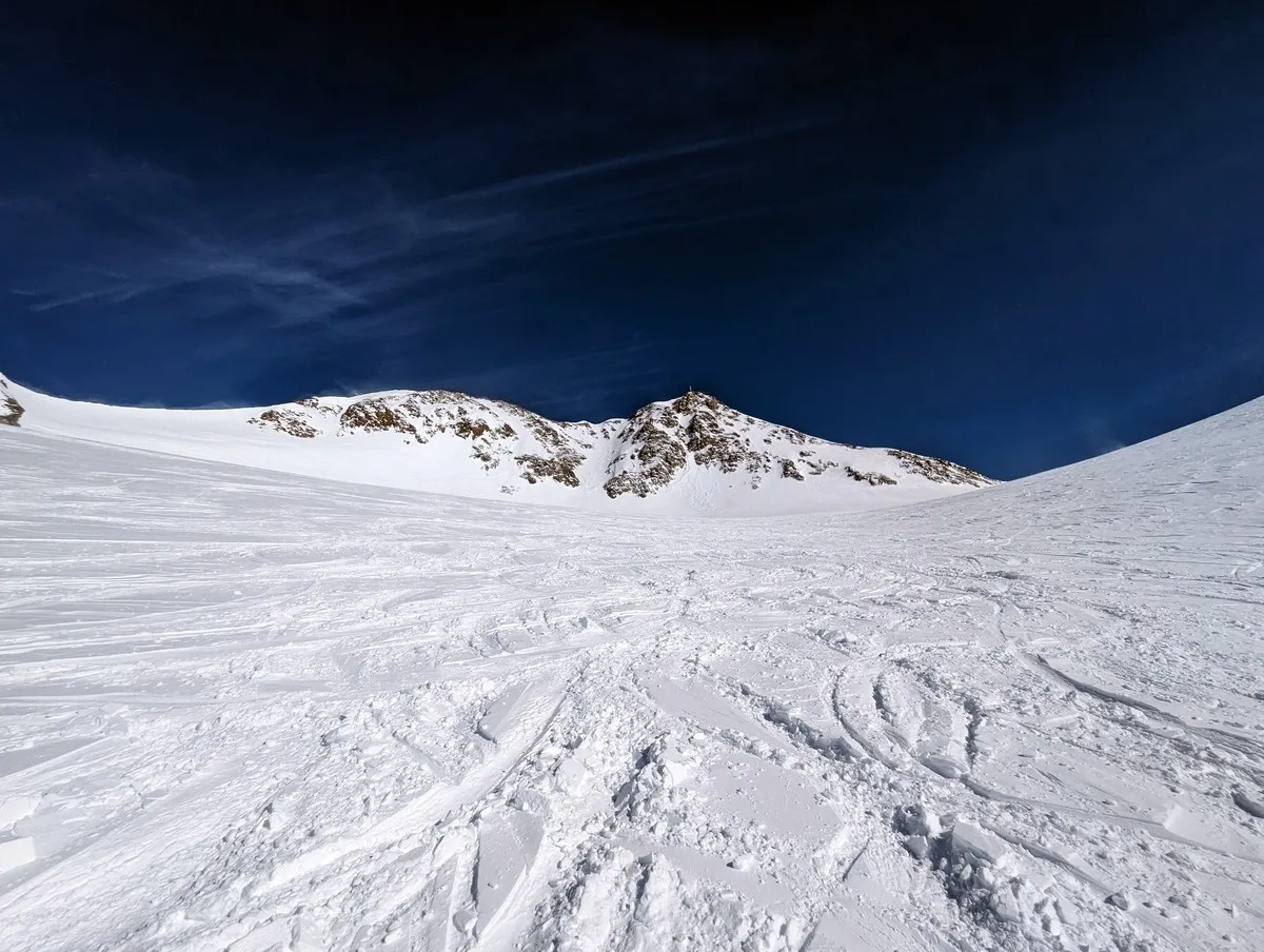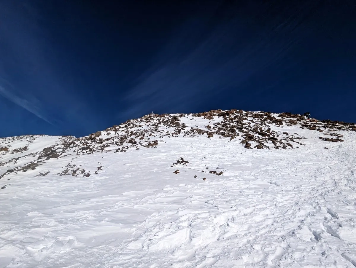 Der Westgrat auf den Gipfel ist aber durchaus fordernd, vor allem mental, da man sich im akut absturzgefährdeten Gelände bewegt. Für den Grat benötigt man im Schlussabschnitt in der Regel Steigeisen. Ich hatte keine Steigeisen mit, da ich die Tour spontan nach ein paar Stunden Freeriden am Nachmittag noch ergänzt hatte. Ich musste zwei Mal überlegen, ob ich mir die letzten zehn Höhenmeter zum Gipfel tatsächlich ohne Steigeisen antue.
