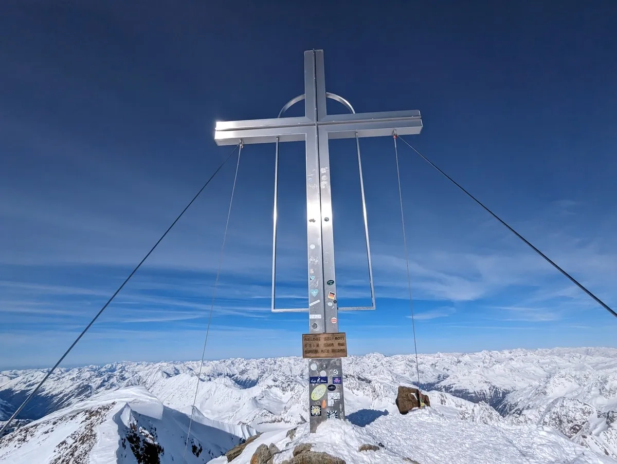 Skitour Wildspitze 13: Gipfelkreuz. Da ich erst um 14:15 Uhr vom Mittelbergjoch starte, bin ich tatsächlich ganz alleine auf der Wildspitze.