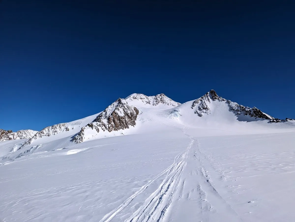 Deutlich komplexer kann aber der Schlussabschnitt über den Westgrat sein. Von diesem sind es etwa 100 Höhenmeter bis zum 3.768 Meter hohen Gipfel. Bei guter Schneelage besteht der Großteil des Grates aus angenehmen Gehgelände. Die letzten 10 bis 20 Höhenmeter sind aber deutlich ausgesetzter und zumeist vereist. Demnach sollten auf jeden Fall Steigeisen und Eispickel mitgenommen werden.