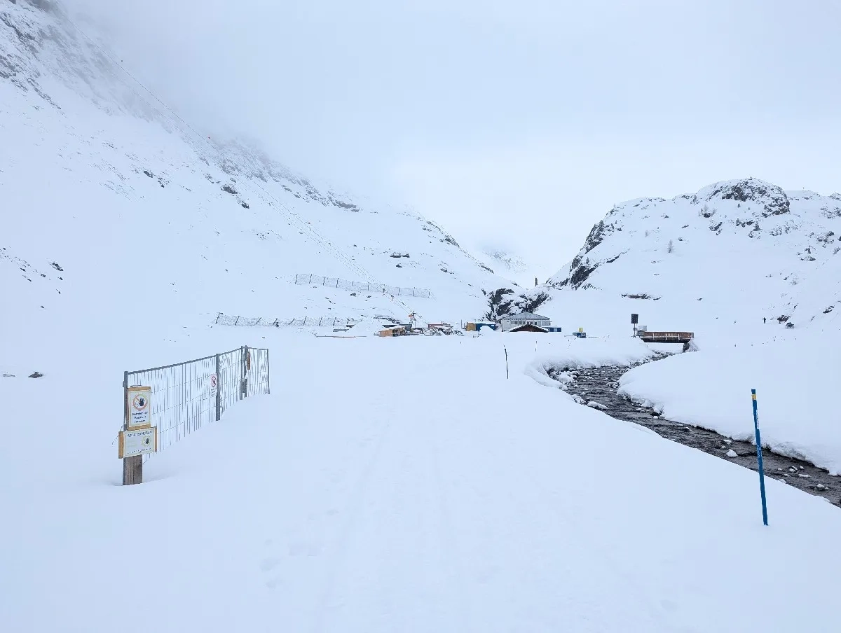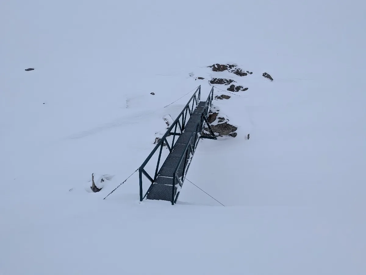 - Nach der Steilstufe passiert man rechts eine Brücke, die als Verbindung zwischen Amberger Hütte und den Skigebiet Stubaier Gletscher bzw. dem Hinteren Daunkopf dient. Es geht nun aber lange südlich entlang, bis auf etwa 2.700 Metern Höhe der Gletscherbeginn erreicht wird.