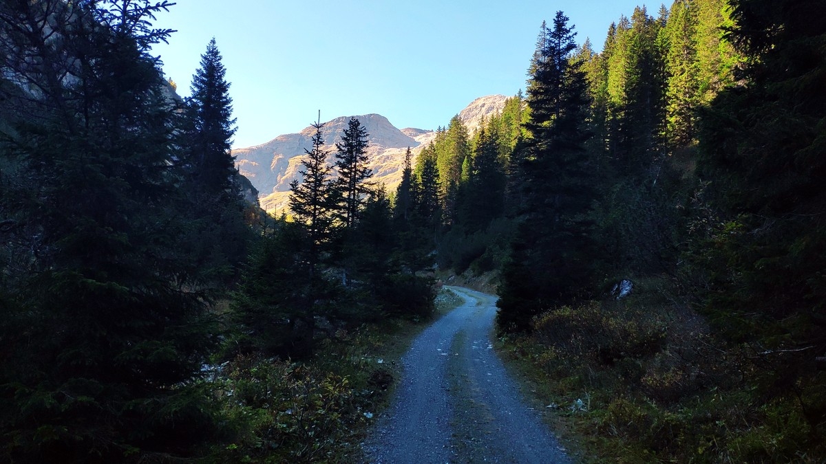 - Über den Wasserfallweg auf eine Forststraße. Dieser Straße sehr lange folgen, bis nach rund 4 km das Stierlochjoch erreicht wird. (Es gibt auch einen Wanderweg, der etwas oberhalb von der Forststraße verläuft und erst im Schlussabschnitt vor dem Stierlochjoch auf die Forststraße führt).