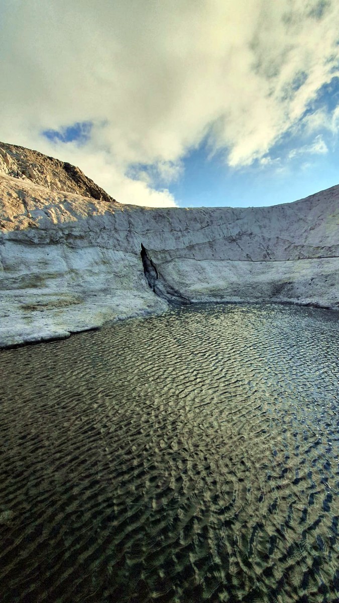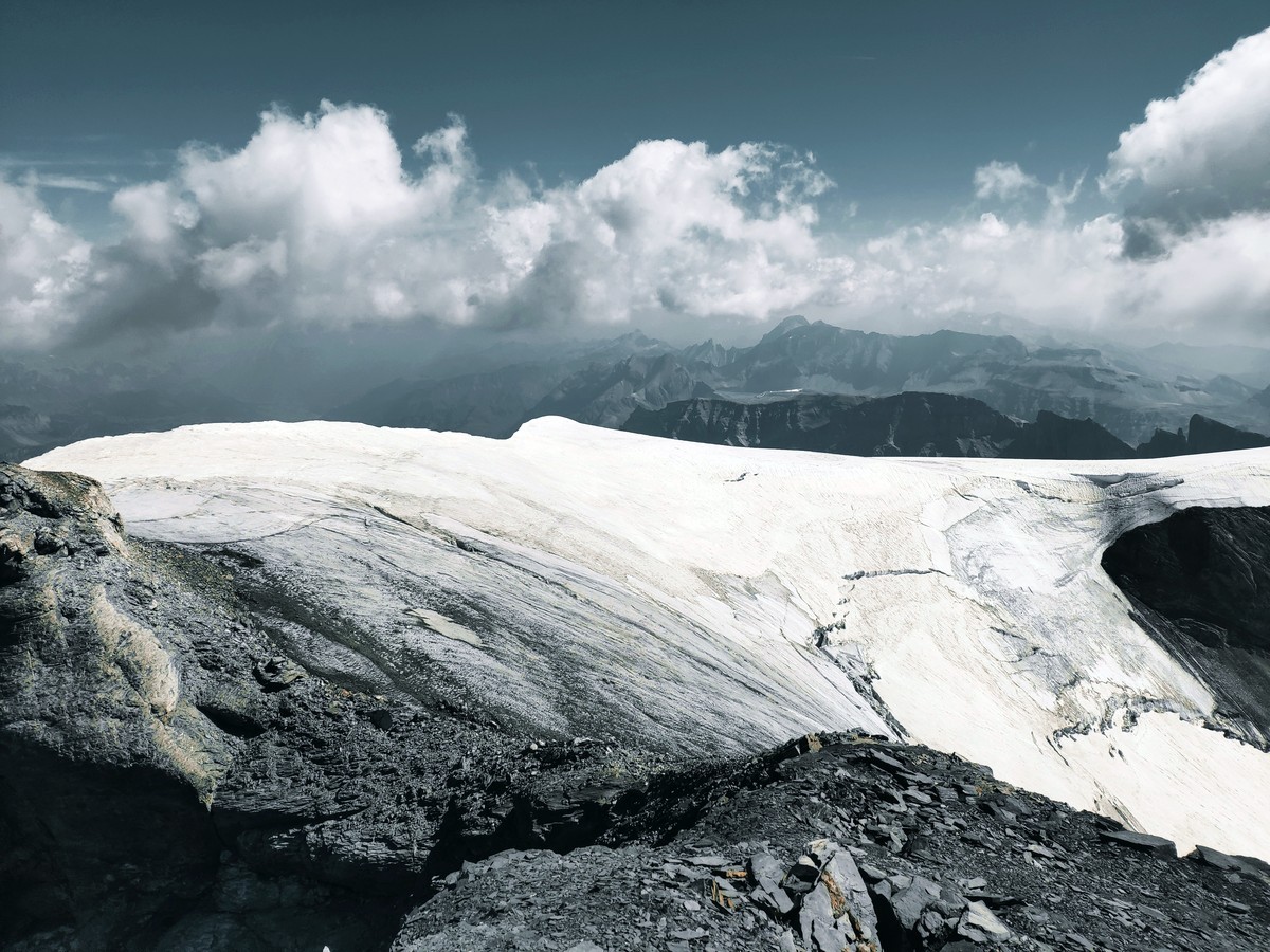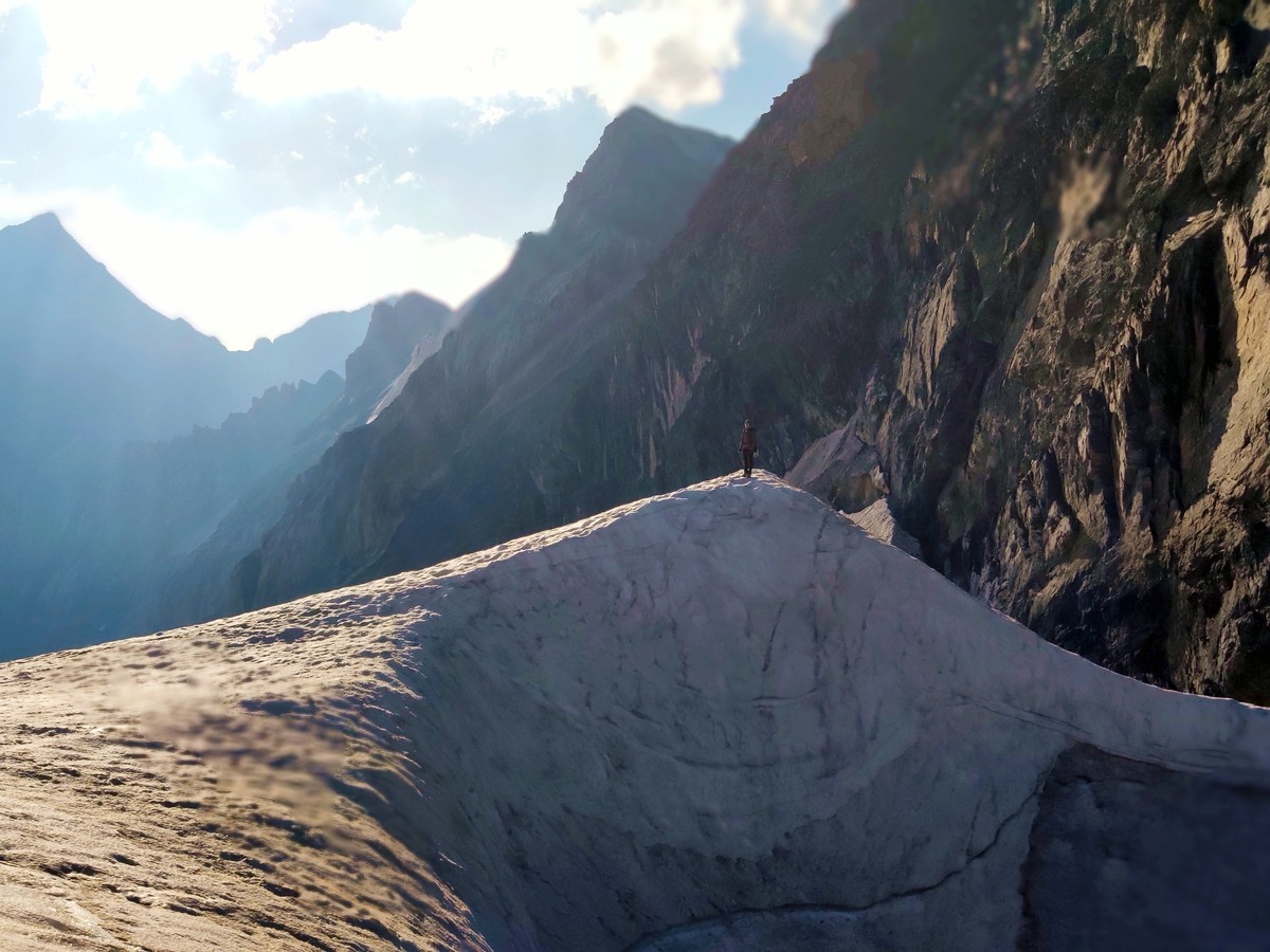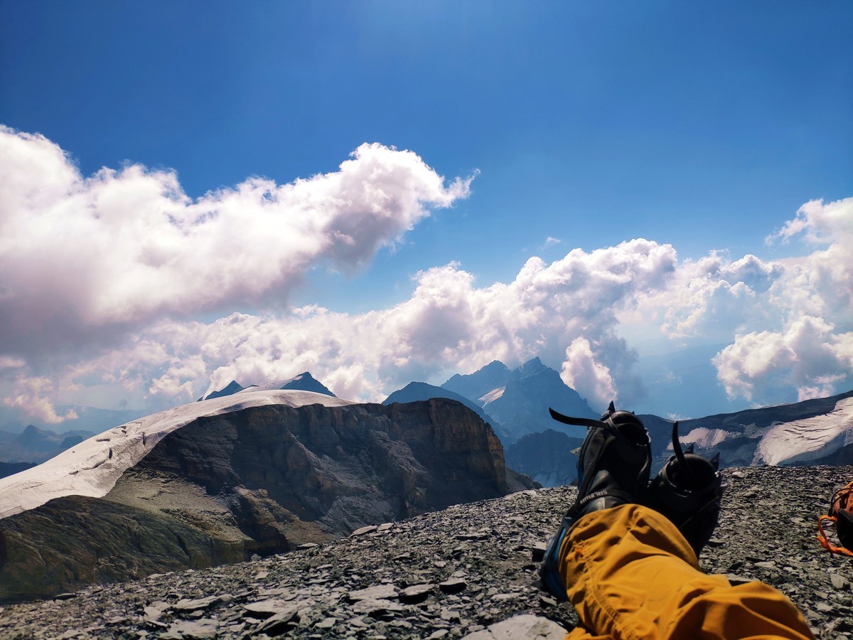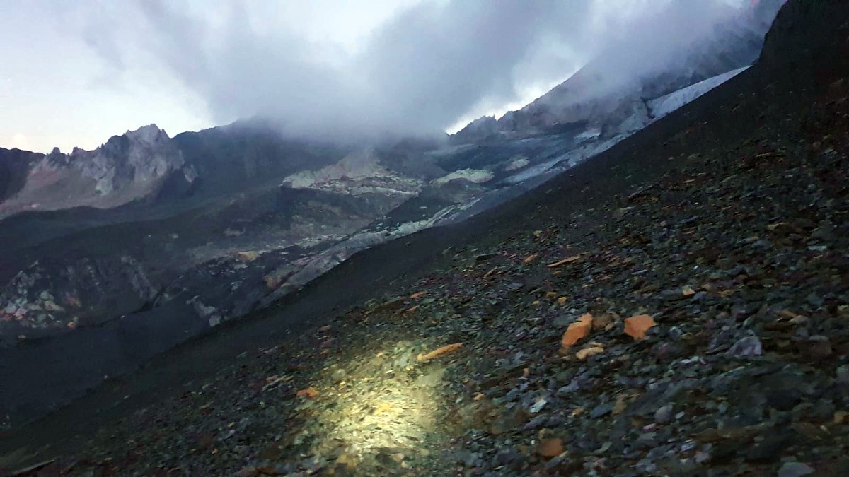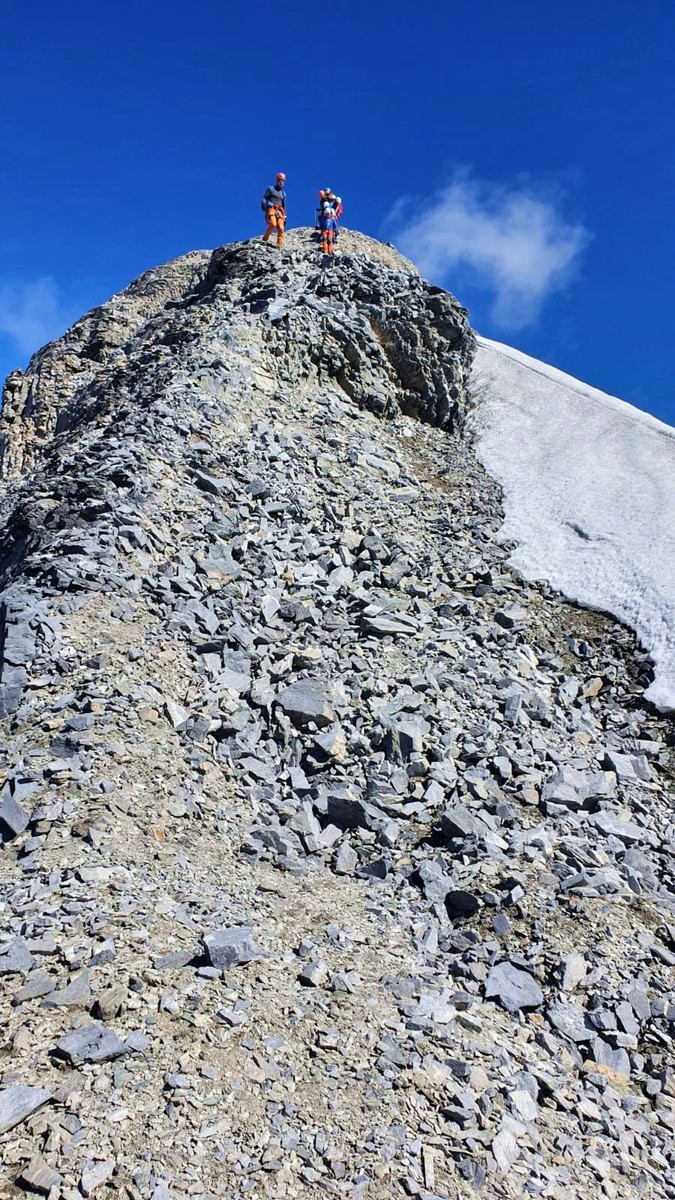 Anmerkung: Die effektivste Route über den Gletscher kann sich, je nach Bedingungen, binnen wenigen Tage stark ändern. Hier angegeben ist die gewählte Route im Hochsommer 2022. Der Abstieg direkt vom Gipfel erfolgte die ersten 200 Höhenmeter über den Südgrat, welcher definitiv die sichere Variante im Gegensatz zum Aufstieg mitten durch den Gletscher war.