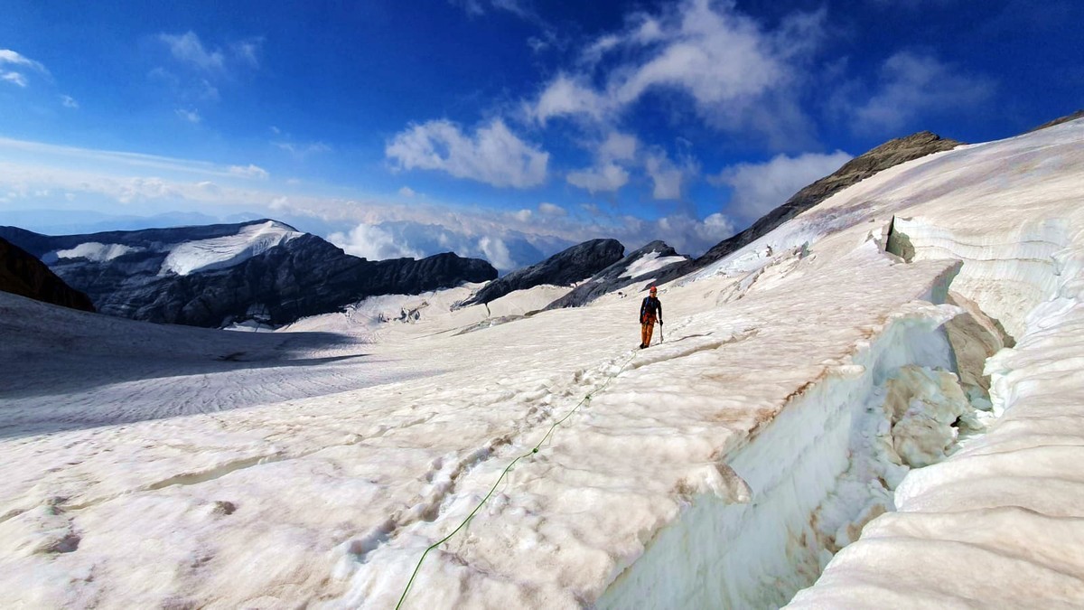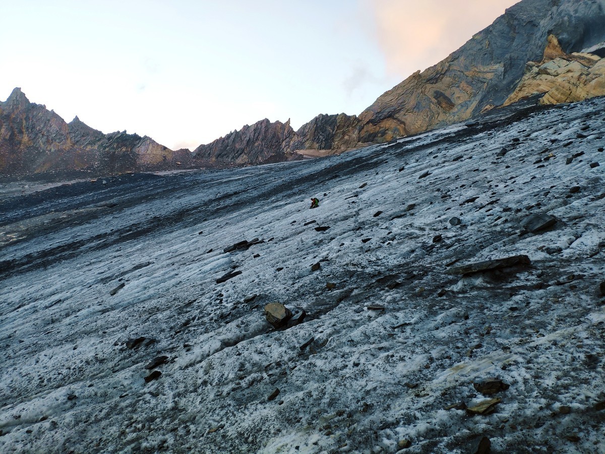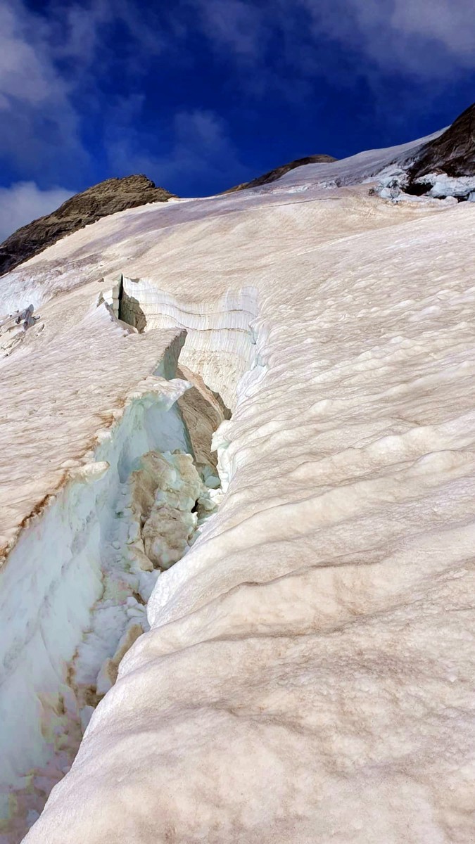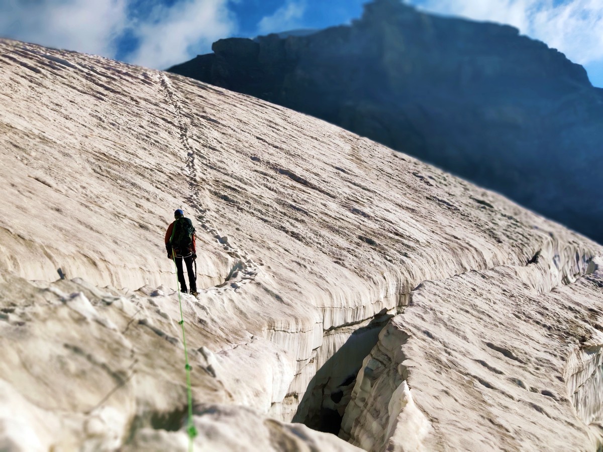 - Dort beginnt nun der anspruchsvolle Gletscherabschnitt. Achtung: Verdeckte Spalten sind gleich zu Beginn möglich.