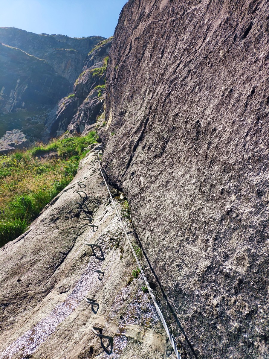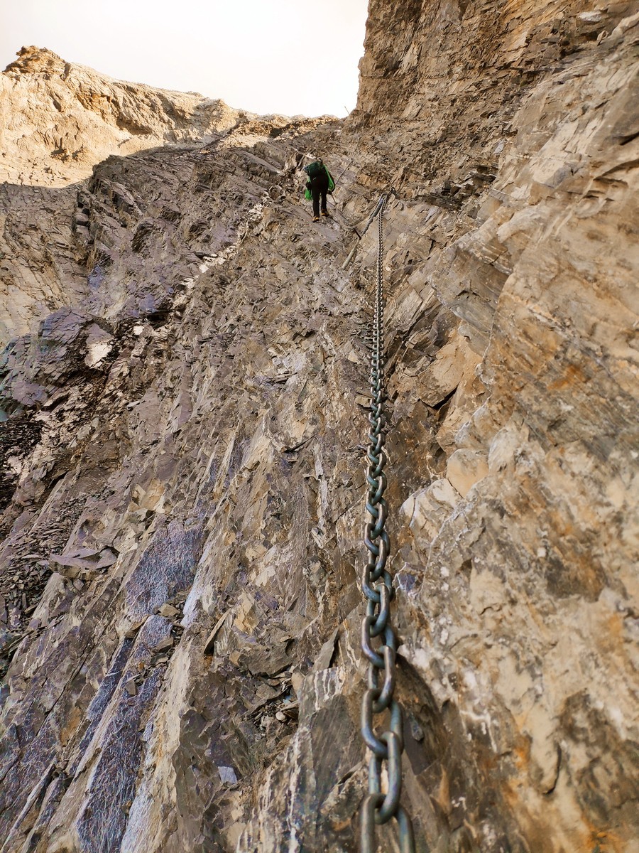 - Auf etwa 3.100/3.200 Metern Höhe führt eine längere Versicherung mit Ketten (stark steinschlaggefährdert) auf die Porta da Gliems. Es ist der einzige Abschnitt mit kurzem Klettern (max. UIAA 2).