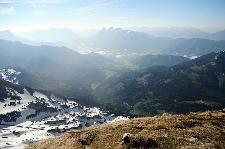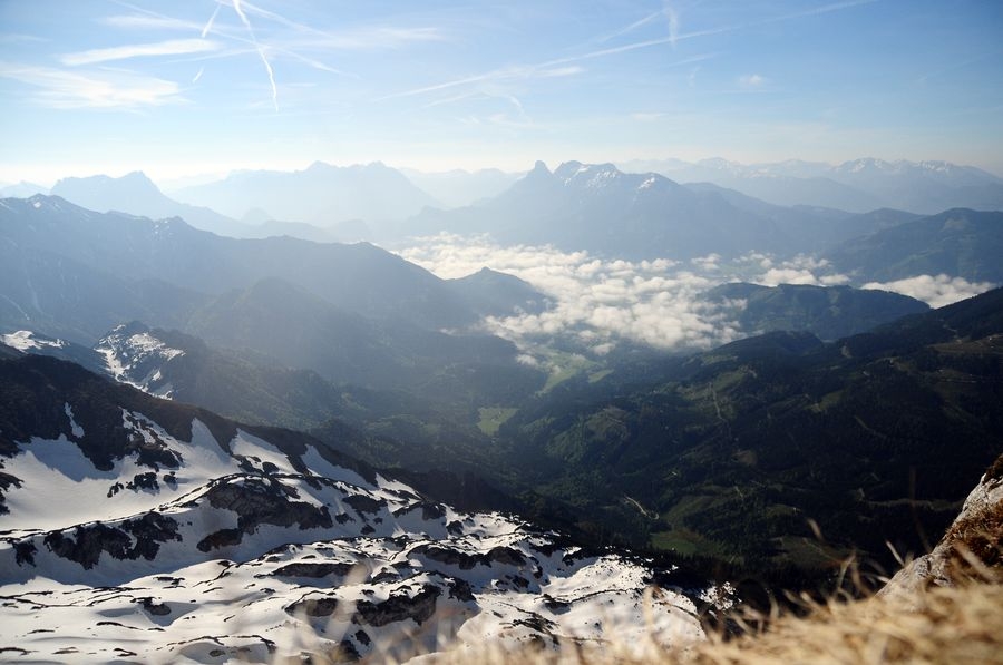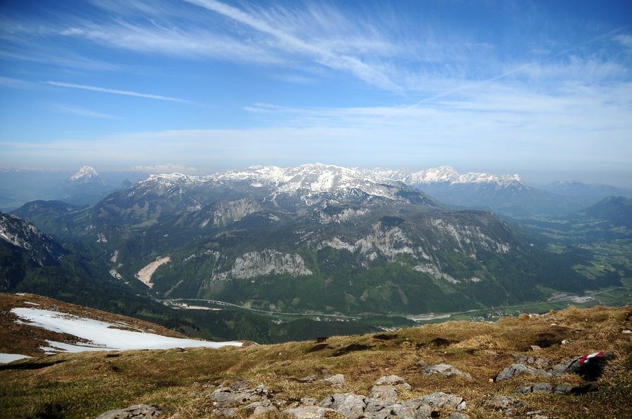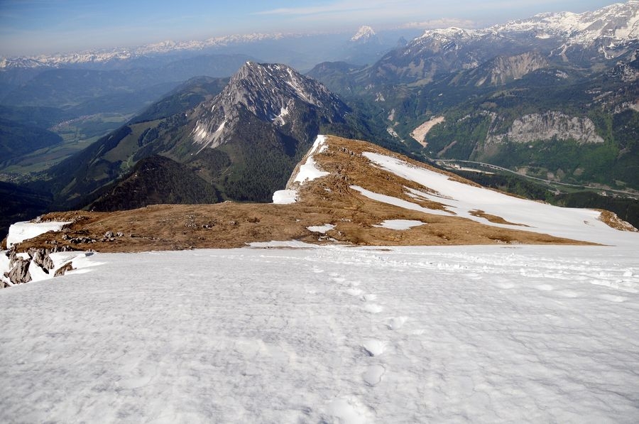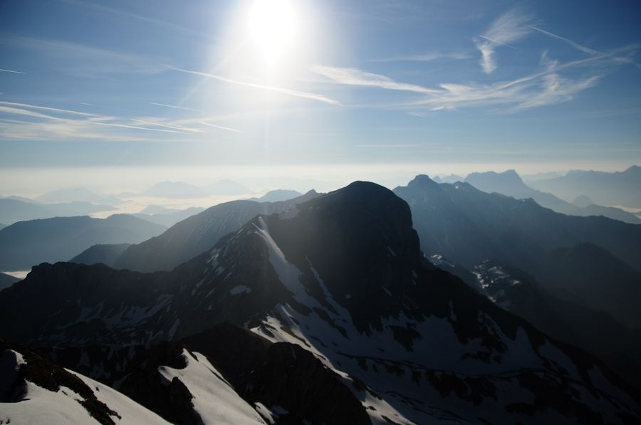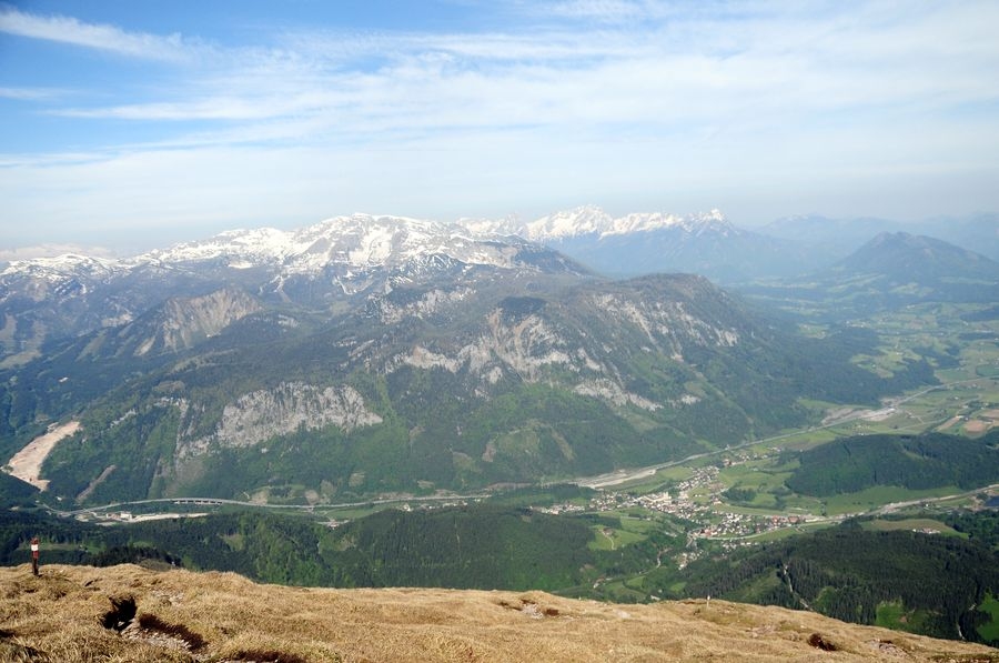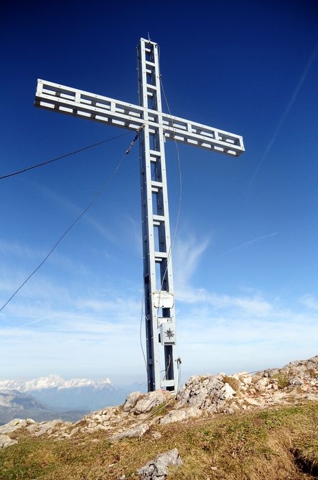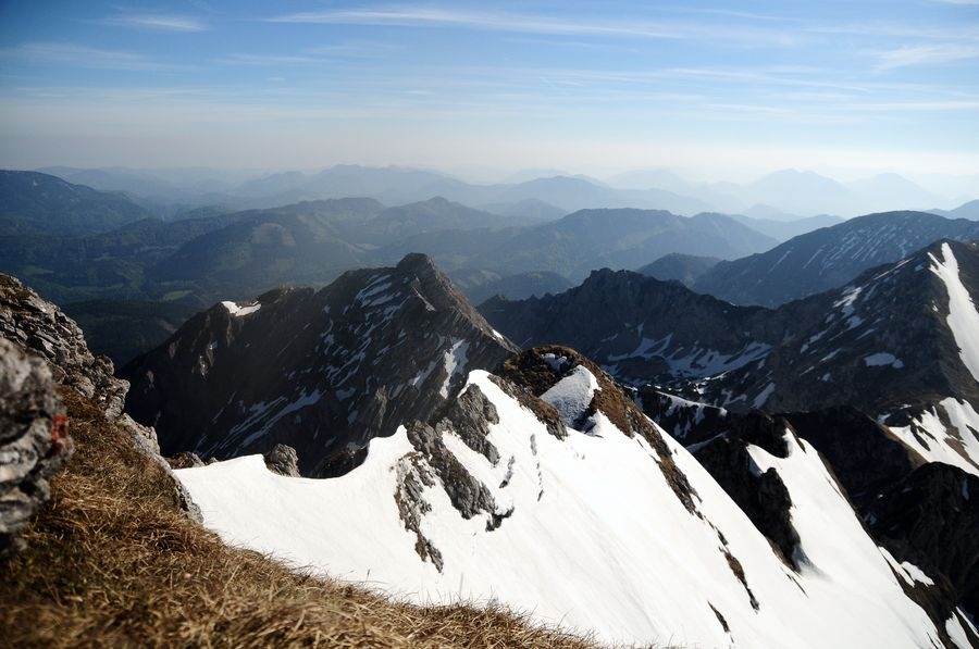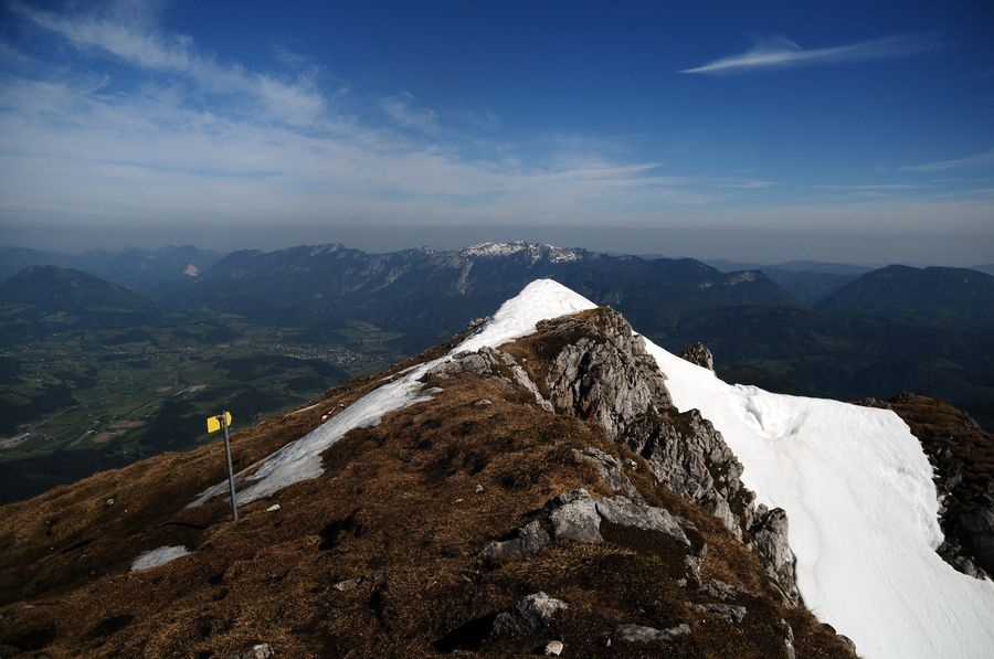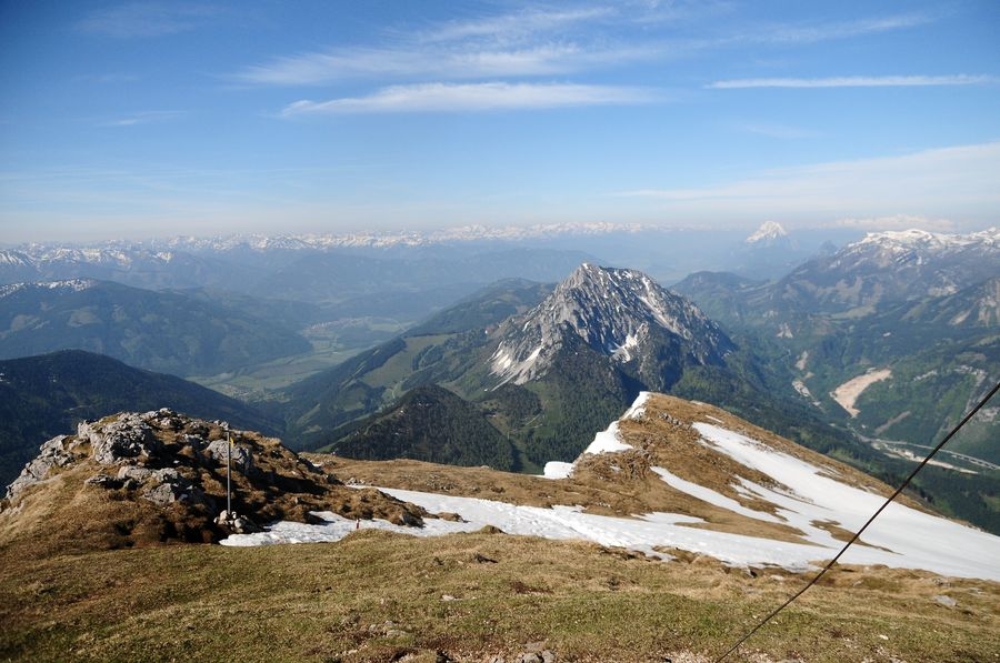 Am Gipfel angekommen ist bei wolkenfreiem Himmel eine großartige Aussicht in alle Richtungen garantiert. Besonders gut zu sehen ist der nur wenige Kilometer entferne Bosruck (1992 Hm).