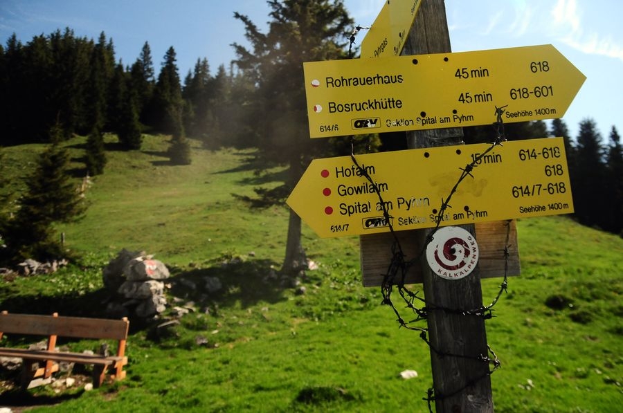 Nach zwei Gehminuten ist die Bosruckhütte erreicht. Von dort folgt man Weg Nr. 601, der Richtung Rohrerhaus führt, wo man einen ersten Zwischenstopp einhalten kann.
