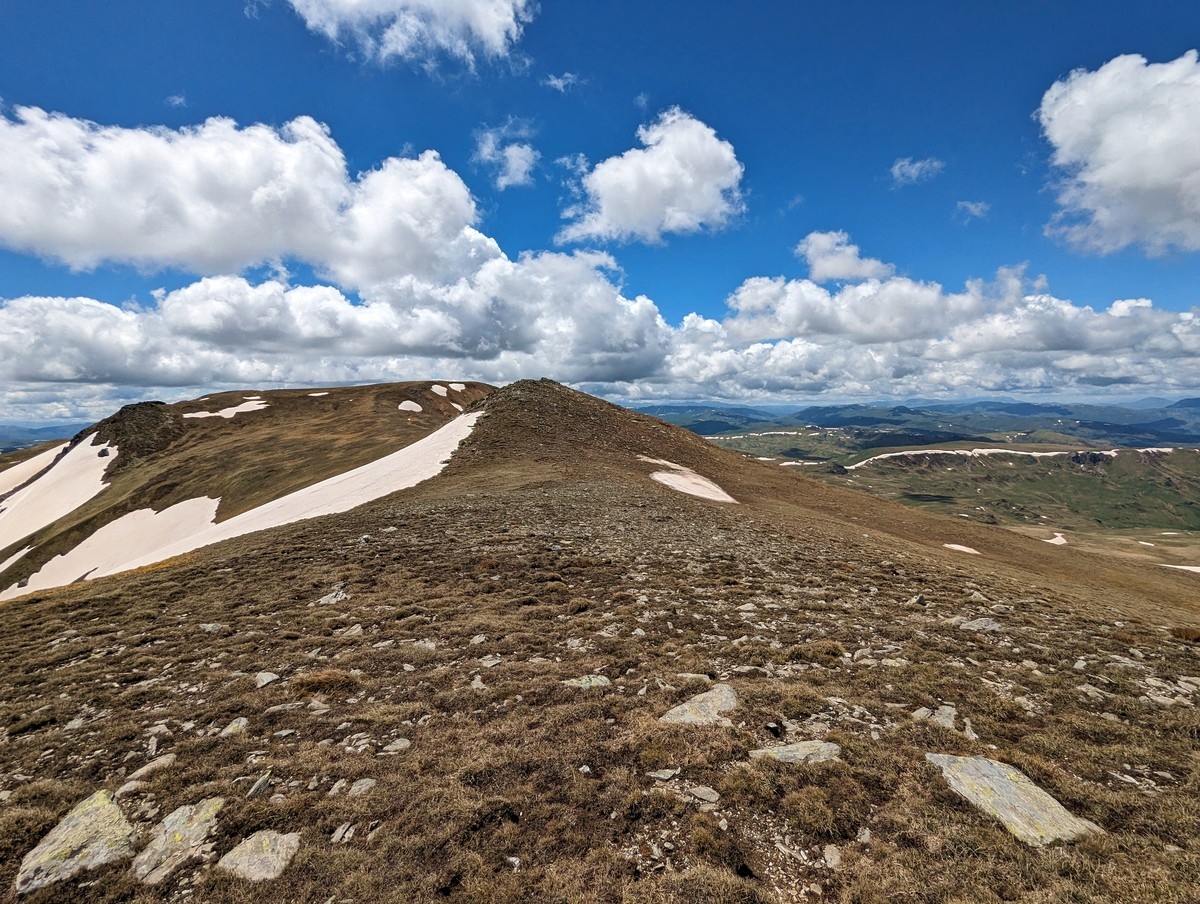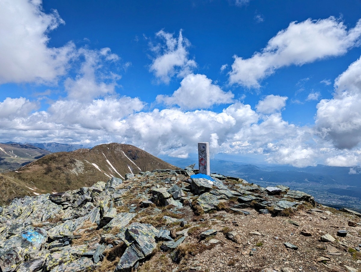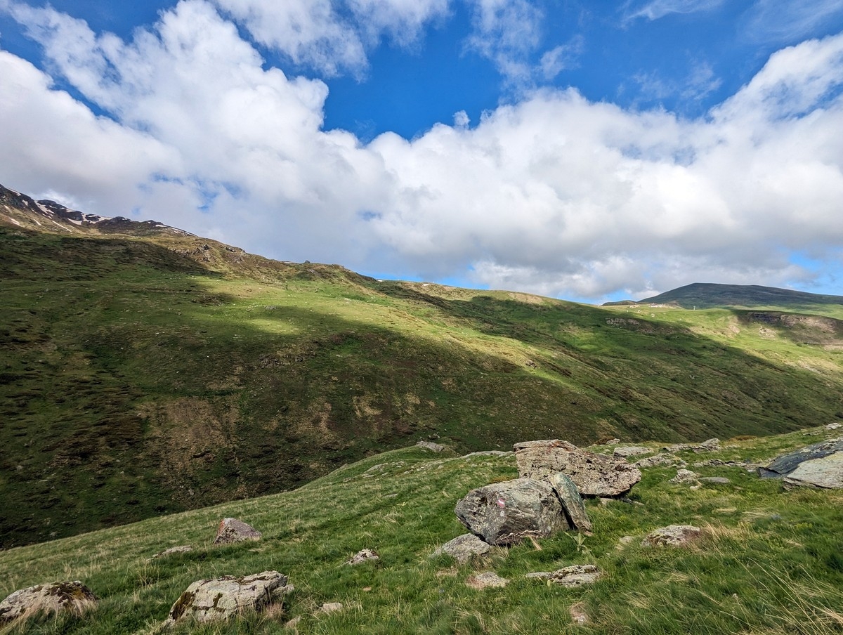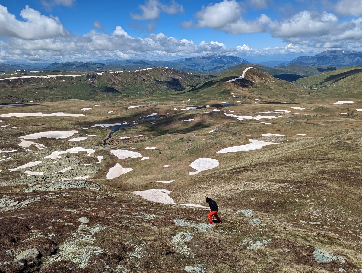 - Abstieg nun die ersten 200 Meter auf identischem Wege und dann am Gipfelkamm entlang und diesen langsam halblinks bergab verlassen auf ein breites Gelände, welches nun in das westseitige Tal führt.
