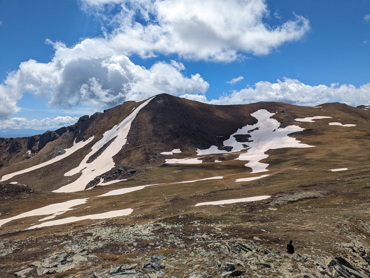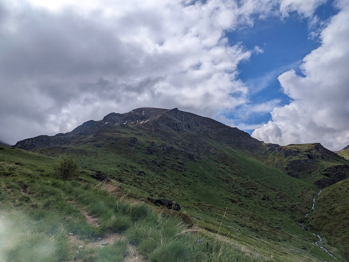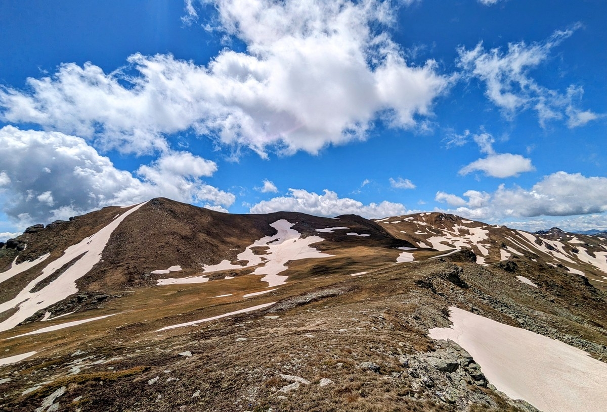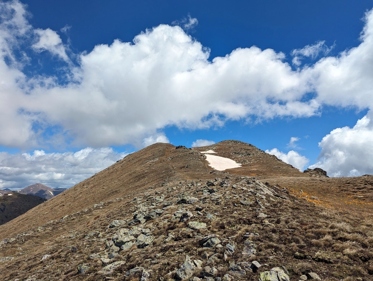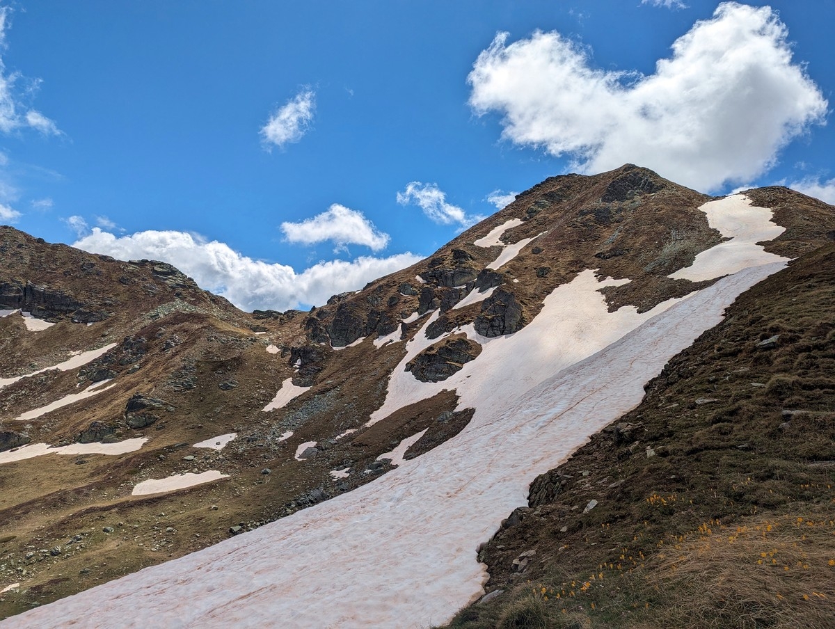 - Da steuert man direkt auf den linken Teil eines langen Gipfelkamms zu. Die eingezeichnete Route führt links davon in eine Scharte, man kann aber auch etwas weiter rechts schon auf den Kamm aufsteigen.