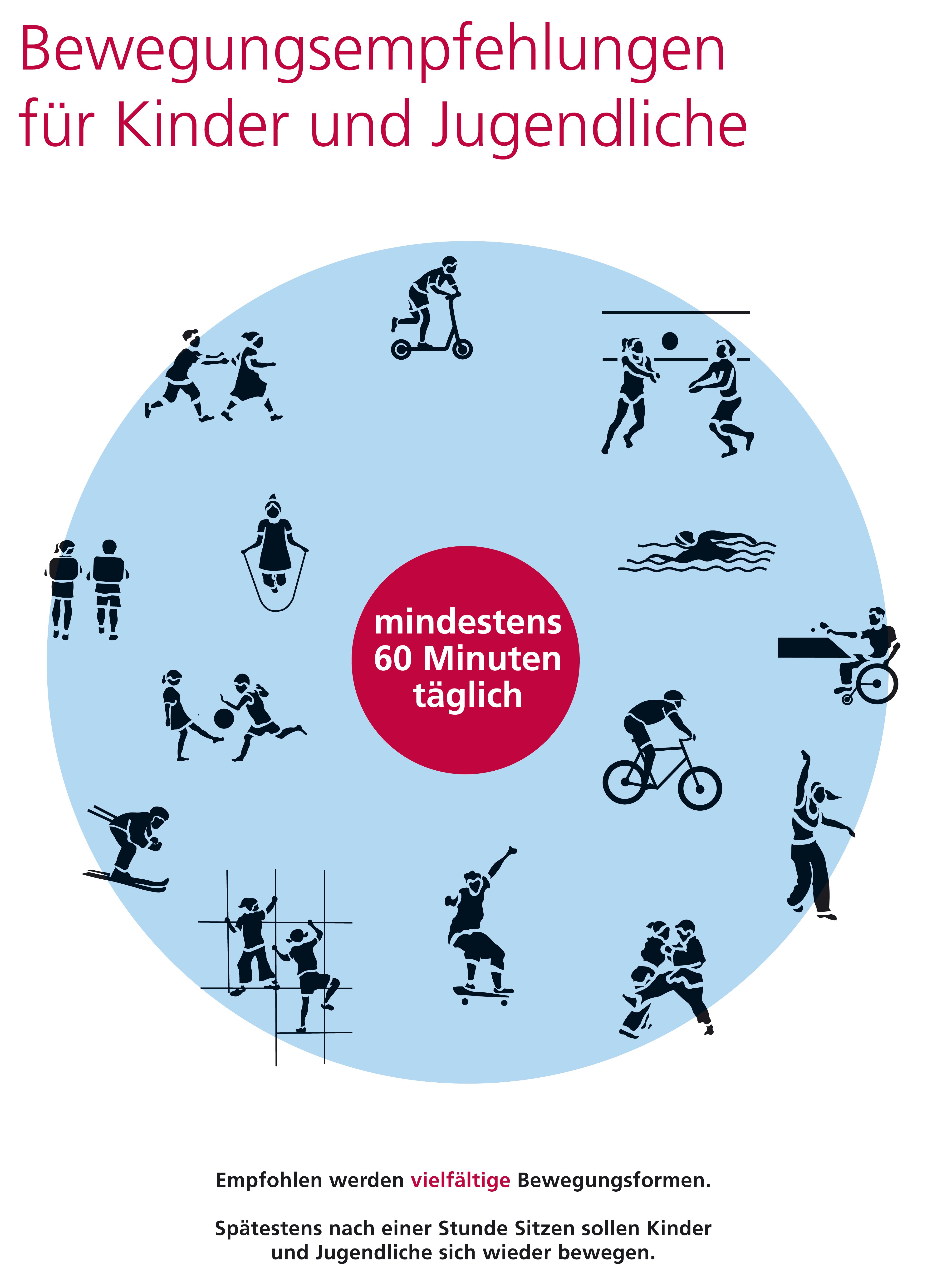 Grafik Kinder Jugendliche BNeu gestaltete Grafiken zeigen Beispiele, mit welchen Bewegungsformen man auf das empfohlene Bewegungspensum kommt. Wer dabei nur an Sport denkt, irrt - es müssen nicht schweißtreibende Höchstleistungen sein. "Es reicht es schon, kurze Wege mit dem Fahrrad zurückzulegen, auf den Fahrstuhl zu verzichten und konsequent Treppen zu steigen oder ausgedehnt spazieren zu gehen" so Christa Peinhaupt die Leiterin des Fonds Gesundes Österreich. Wenn kleine Bewegungseinheiten in den Alltag eingebaut und zur Routine werden, ist die Chance groß, dass sich die Menschen auf lange Sicht mehr bewegen. Mäßig, aber regelmäßig ist die Devise, insbesondere für all jene, die nach einer Pause wieder neuen Schwung in ihr Leben bringen wollen.