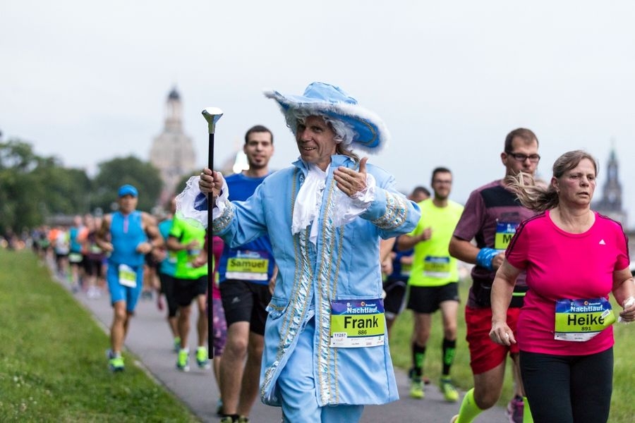 Gesäumt von den Besucherscharen des Dresdner Stadtfest startet ihr mit dem 11,8 km Lauf am Abend mitten in der Stadt in Richtung Elberadweg. Dort führt die Strecke mit Blick auf die romantisch beleuchteten Elbschlösser bis zum Blauen Wunder. Bei zunehmender Dämmerung habt ihr dann schon bald die nächtliche Dresdner Skyline vor Augen, während euch Knicklichter und Fackeln den Weg weisen.