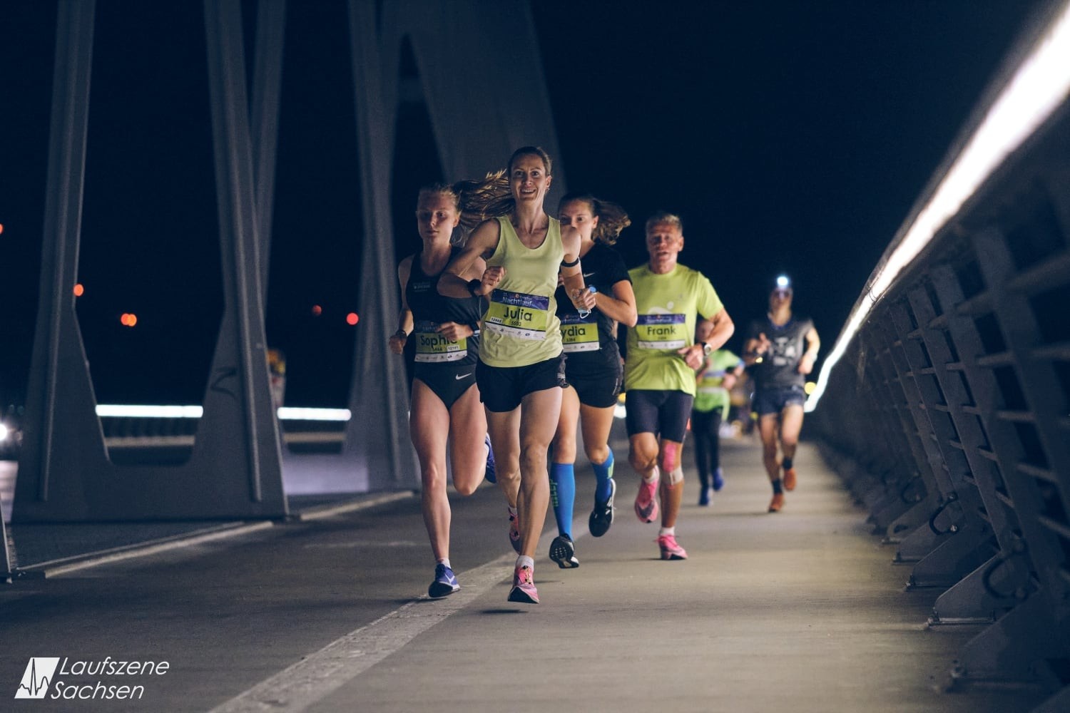 Erlebt eine traumhaft beleuchtete Strecke mit Blick auf die Dresdner Skyline und ein Meer aus Fackeln und Knicklichtern - ein absolutes Highlight in eurem Laufkalender!