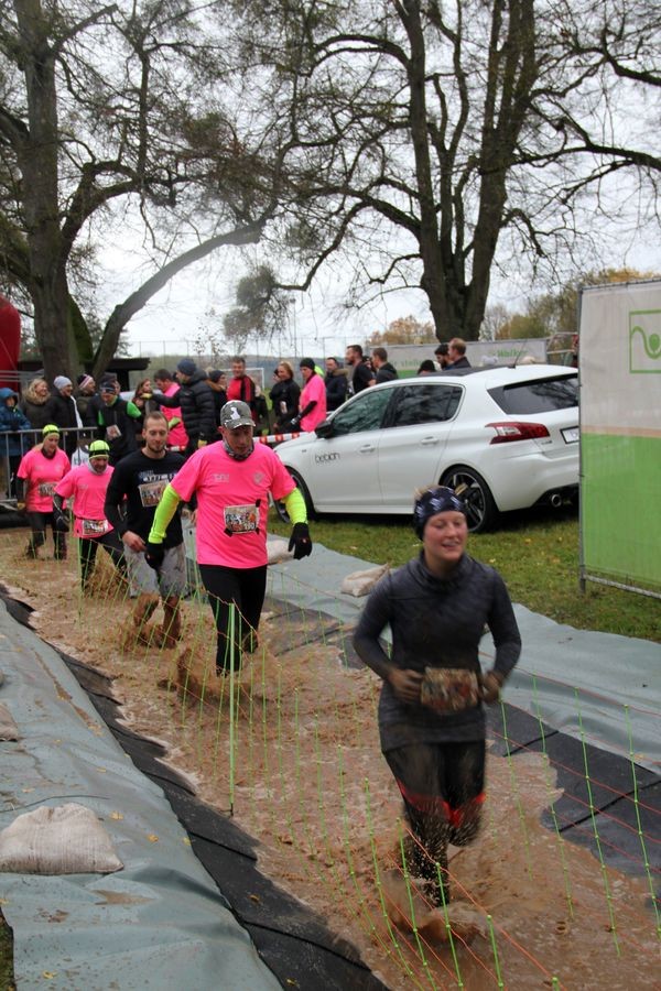 Die Strecke ist durch verschiedene Hindernisse wie Reifenstapel, Klettergerüst, Wassergraben, Wasserrutsche und Netze für die Läufer präpariert.