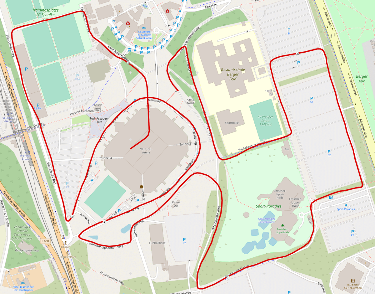 Strecke: Ötte-Tibulsky-Weg, Paul-Matzowski-Weg, Ernst-Kalwitzki-Weg, Hermann-Eppenhoff-Weg, Ernst-Kuzorra-Weg