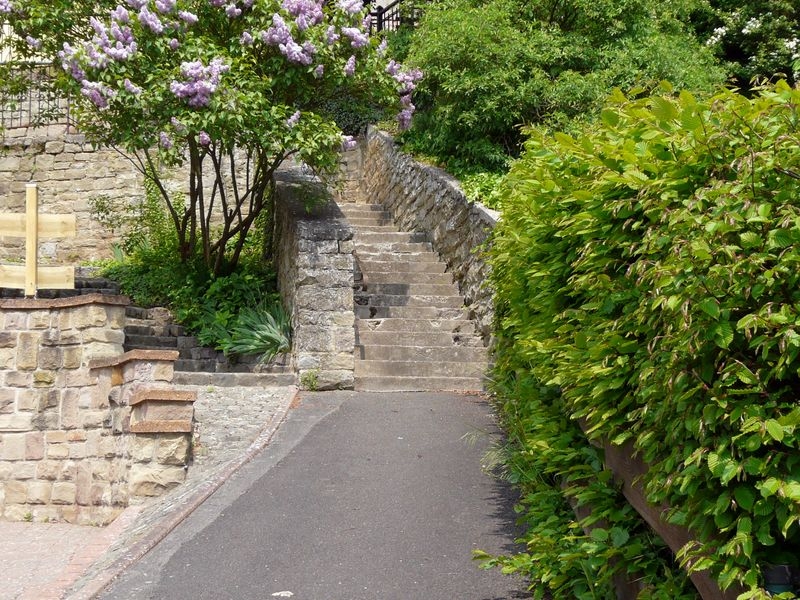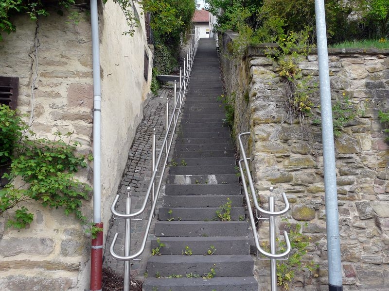 In der "Oberstraße" kann man seinen Beinen (Muskeln) aber nur kurzzeitig Erholung bieten, denn es geht gleich weiter zum nächsten und letzten Anstieg, dem "Gebück", mit seinen langgezogenen Treppenstufen, die nun einen anderen Laufrhythmus als auf der "Talstreppe" verlangen.