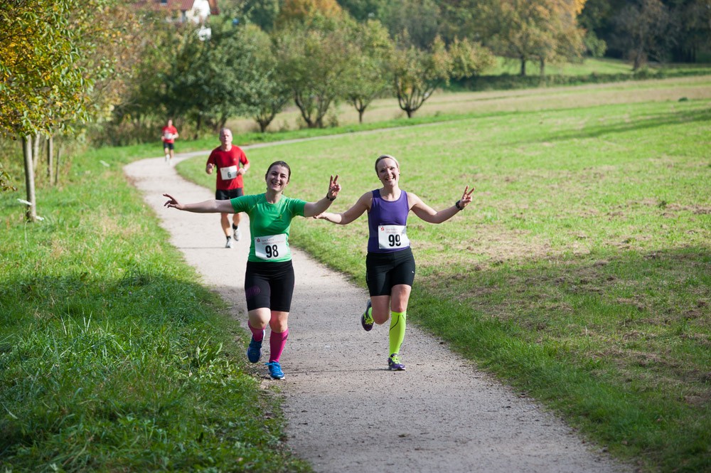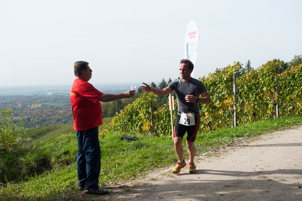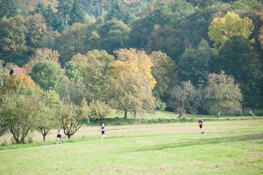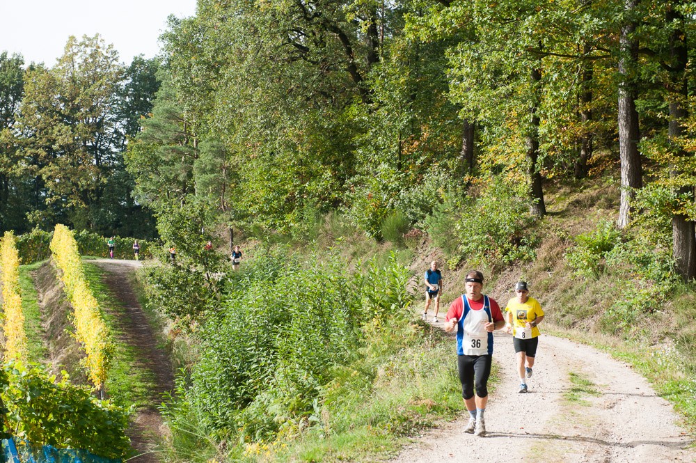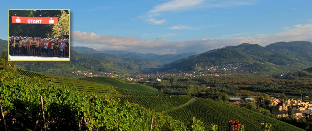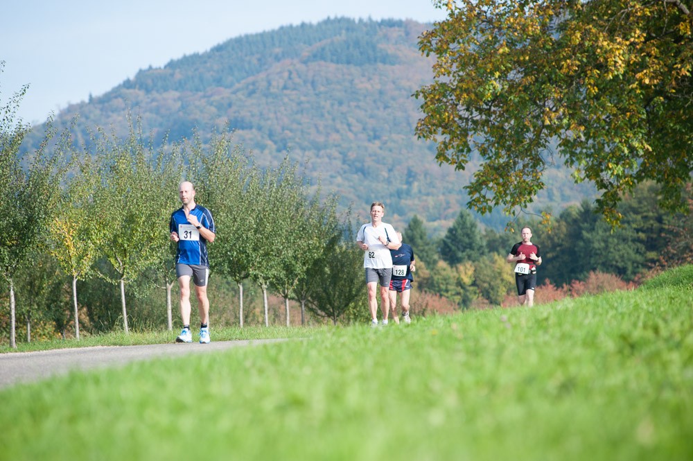 Für die 8km und die 14km beginnen hier die kräftigen Anstiege und damit die Herausforderungen für jeden ambitionierten Läufer. Auf wurzeldurchzogenen Waldwegen geht es durch Obstplantagen, Wald und Weinreben Richtung Bienenbuckel zur höchsten Erhebung von Oberachern. Hier oben angelangt belohnt die Anstrengung ein herrlicher Blick in die Rheinebene, weit hinein bis nach Frankreich, bei gutem Wetter sogar bis zu den Vogesen. Nach einem weiteren Anstieg an der Südseite des Weinberges genießt das Auge der 14er die dunkelgrüne, lang gezogene Silhouette des Schwarzwaldes mit der Schwarzwaldhochstraße on Top. Nach dem Passieren der Verpflegungsstation geht es wieder hinein in den kühlen Wald, gefolgt von einem weiteren und letzten kräftigen Anstieg. Ist dieser geschafft, laufen die Beine erst noch eine kurze Weile entlang des Kammes und dann nur noch bergab durch Wald und Wiesen zurück zur Illenau. Das Ziel ist der Innenhof mit seinen wunderschönen Arkaden und der tollen Atmosphäre durch die Besucher und der bereits wartenden Läufer der 6 und 8km.