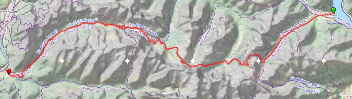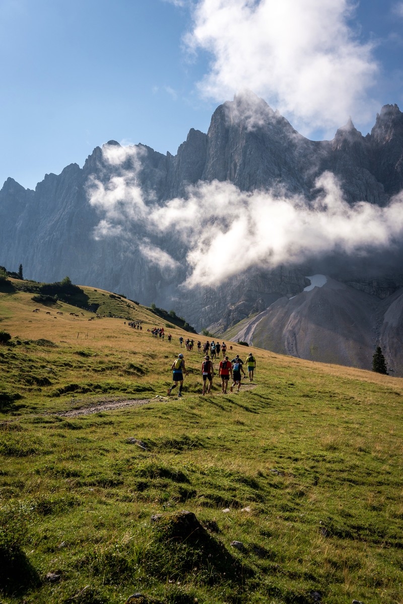 Startschuss in Scharnitz. Danach geht es über die Larchetalm zum Karwendelhaus, weiter zur Ladizalm und Falkenhütte. Die weiteren Checkpoints: Gramai Hochleger, Gramaialm, Falzturnalm. Anschließend führt die Route zum Ziel in Pertisau am Achensee.