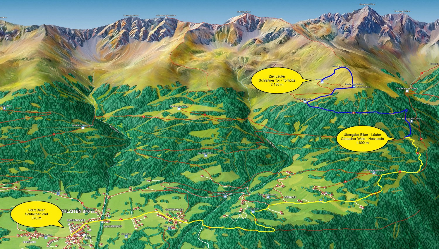 Vom Start im Ortszentrum von Schlaiten fahren die Biker durch den Göriacher Wald hinauf bis zum Hochstein, wo die Übergabe an die Läufer erfolgt. Die Läufer erreichen ihr Ziel, die Schlaitner Torhütte, über das 2150 Meter hohe Moschumandl.