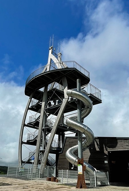 Über 84 Stufen wird die Aussichtsplattform auf 23 m Höhe im Kurzsprint erreicht. Der Rückweg führt für alle Teilnehmer ob jung oder alt auf dem Rutschsack durch die Wendelrutsche nach unten.