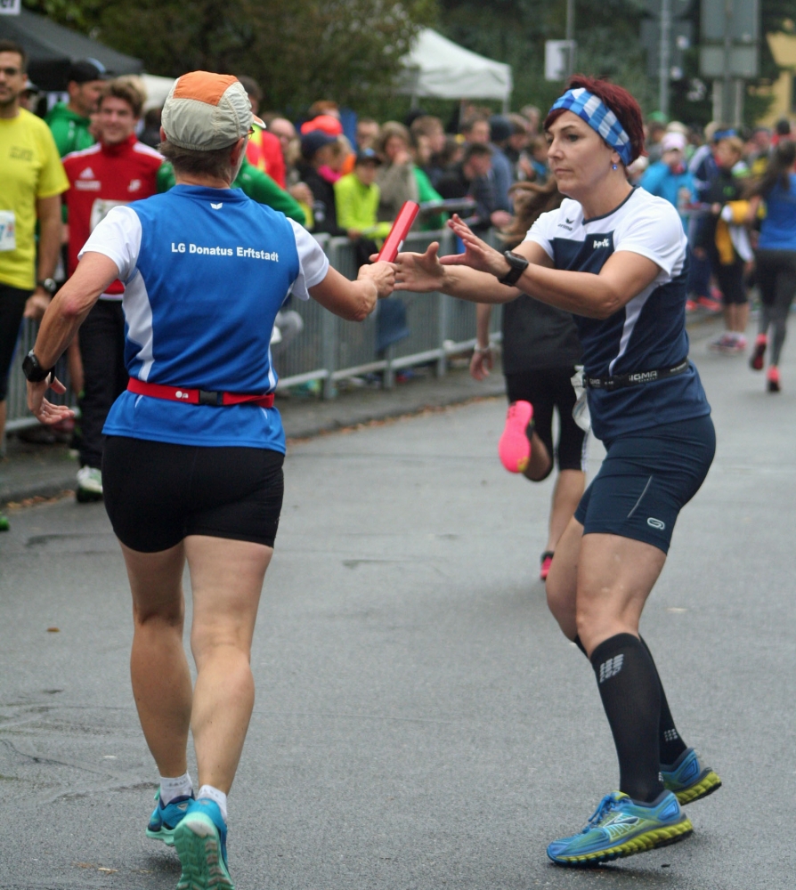 Ein tolles Mannschaftsereignis. Auf einer ca. 2 km langen Strecke teilen sich bis zu 7 Läufer die Strecke oder absolvieren diese bei guter Kondition alleine als Einzelläufer. Die Startreihenfolge bleibt der Staffel überlassen. Jeder Läufer kommt mindestens einmal über eine komplette Runde zum Einsatz, bis die gesamten 42,195 km zurückgelegt sind. In der Wechselzone kann man die prickelnde Atmosphäre, die bei Staffelwettbewerben entsteht, förmlich spüren. Jeder Teilnehmer kann mehrmals in den Start- und Zielbereich einlaufen. Sambagruppen an der Strecke feuern die Aktiven an. Eine attraktive Sache für die Aktiven – aber auch für die Zuschauer. Marathonzeiten, die für Einzelläufer Utopie bleiben, können in der Mannschaft erzielt werden. Teilnehmen können Gruppen, Vereine und Interessengemeinschaften, wobei jeder Teilnehmer (ab U12) sich zutraut, 2 km am Stück zu laufen.