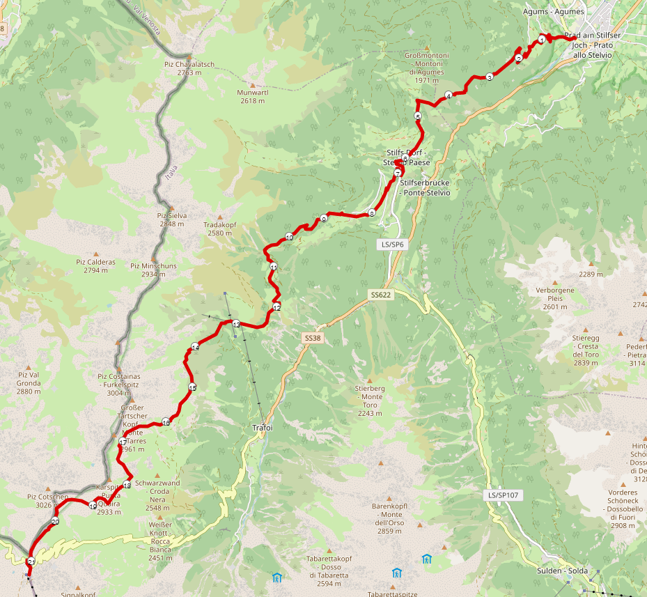 Die 21 km-Strecke, mit Start in Prad am Stilfserjoch (915 m), führt durch das