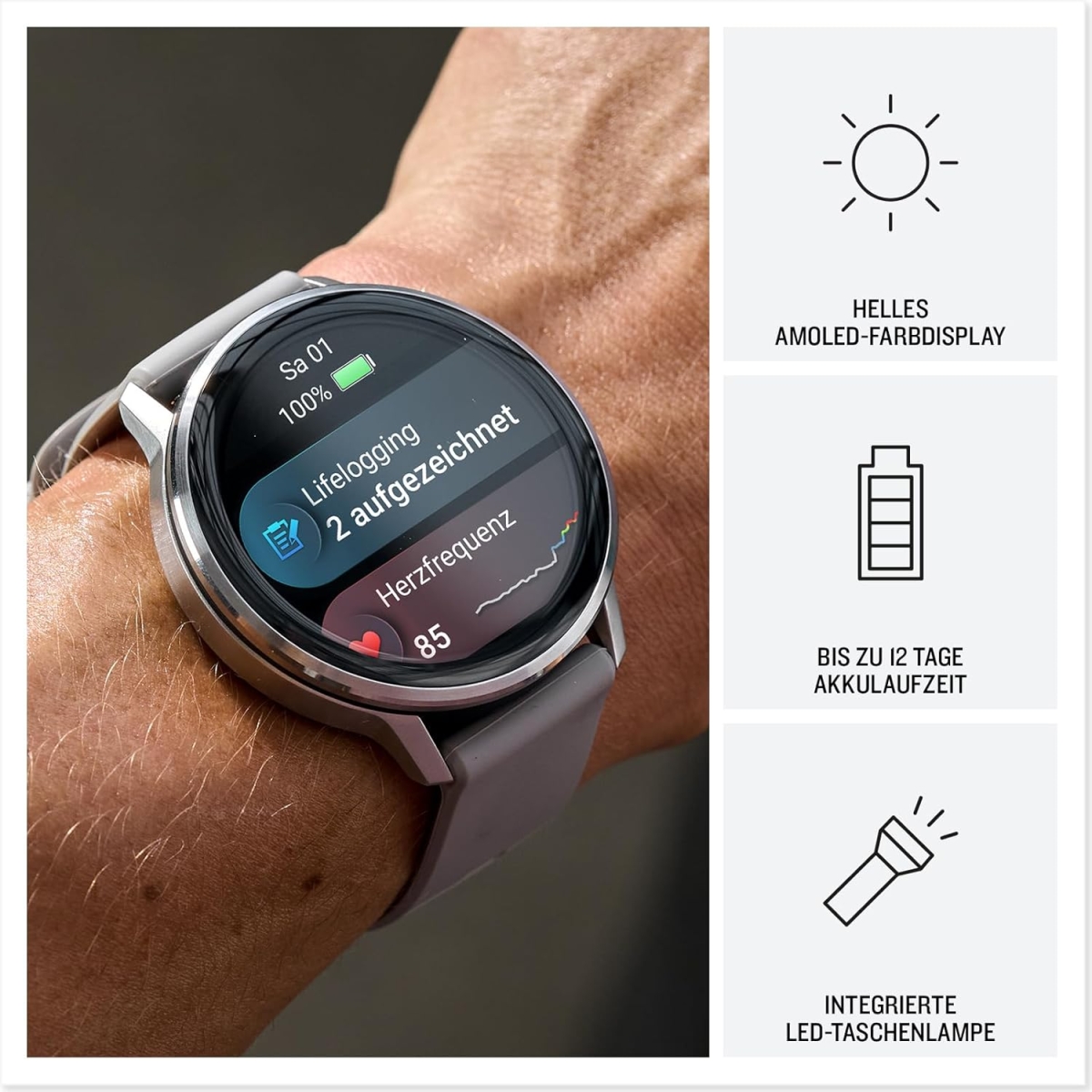 - 1,2-Zoll AMOLED-Display – brillant und klar ablesbar