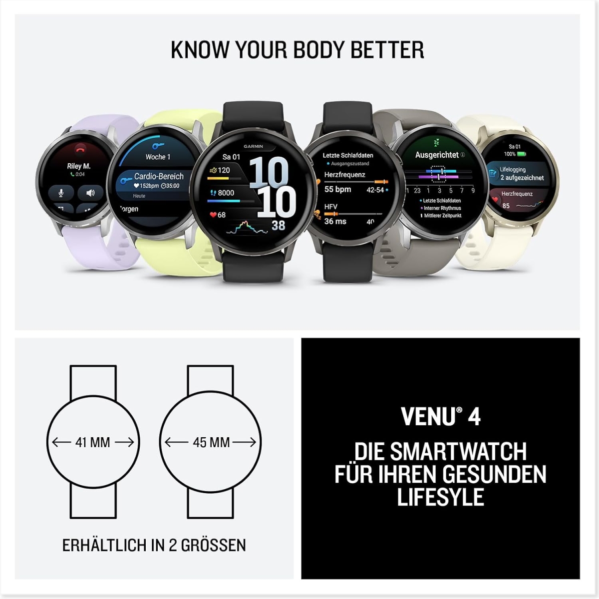 Mit der Garmin Venu® 4 hast du deine Gesundheit, deine Fitness und deine wichtigsten Alltagsfunktionen immer im Blick – stylisch, zuverlässig und voller smarter Möglichkeiten. Eine Uhr, die mehr kann als Zeit anzeigen.