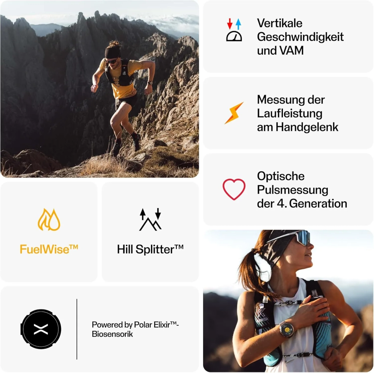 Die Elixir™ Biosensortechniken überwachen deine Vitaldaten präzise und in Echtzeit. Die optische Pulsmessung am Handgelenk liefert genaue Herzfrequenzwerte, während die Hauttemperatur- und Sauerstoffsättigungs-Messungen dir wichtige Informationen über deine körperliche Verfassung geben. So kannst du jederzeit informierte Entscheidungen über dein Training treffen.