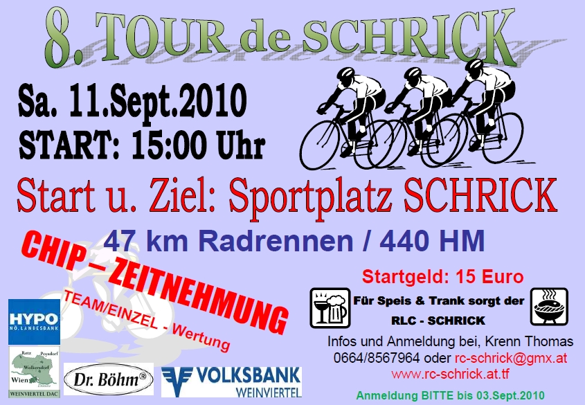 Am 11. September wird zum achten Mal die Tour de Schricka ausgetragen. Der Start ist um 15.00 Uhr am Sportplatz Schrick.