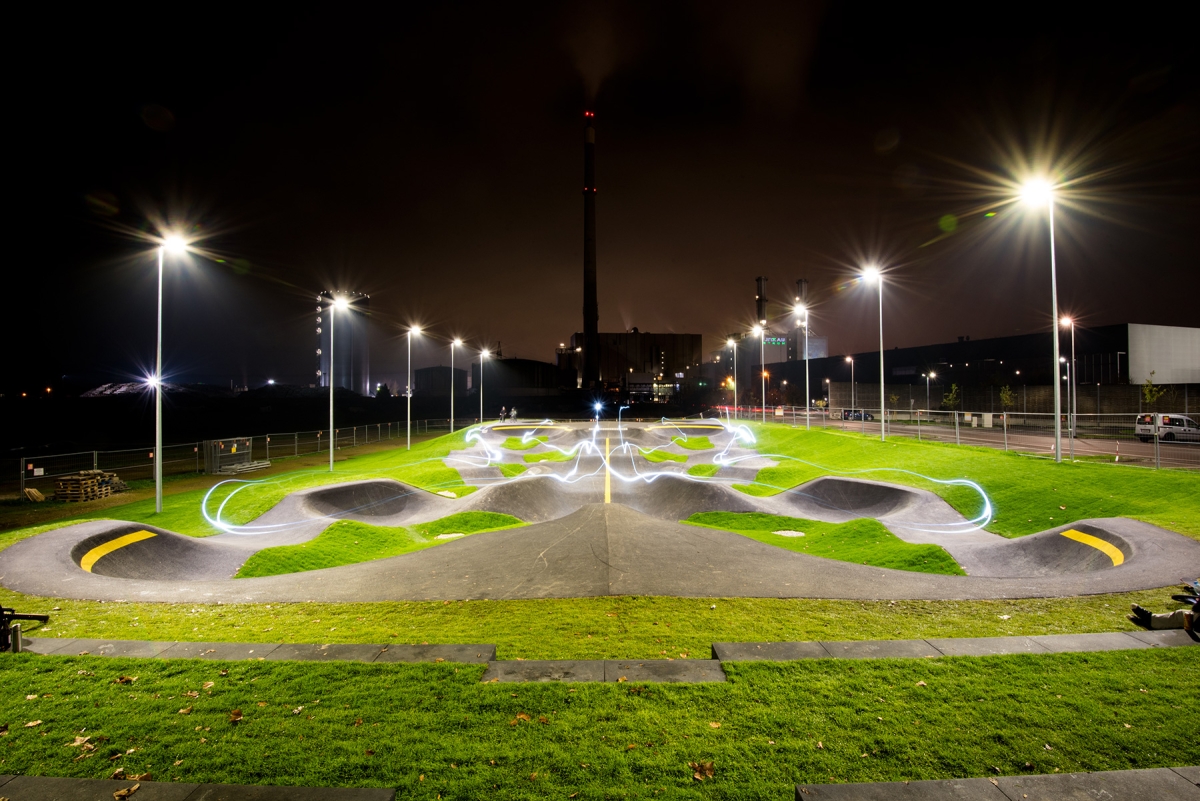 hello yellow Pumptrack Linz. Gespiegelter Asphaltpumptrack.