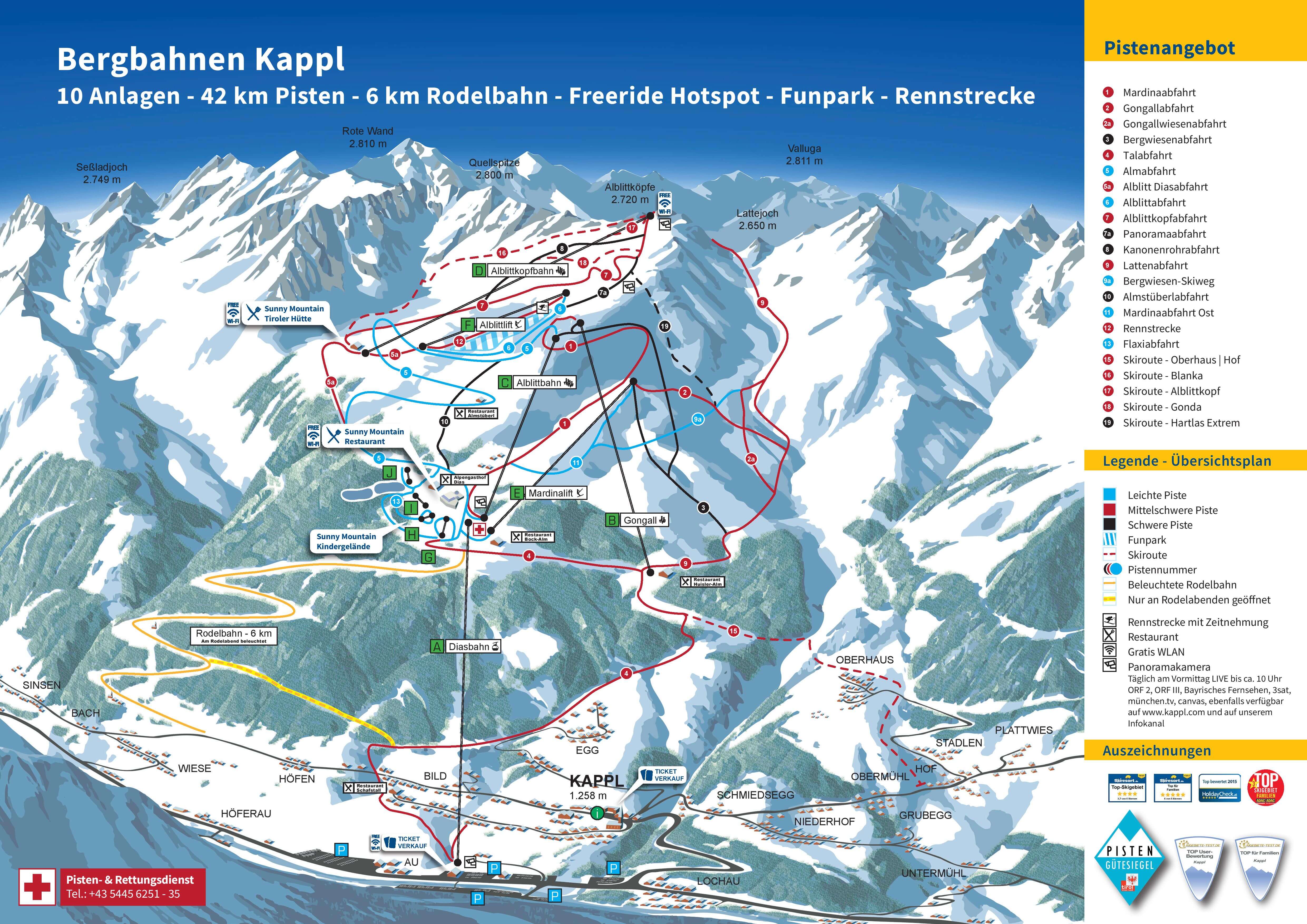 Das Skigebiet Kappl erstreckt sich über 42 Kilometer abwechslungsreiche Pisten, die sich für alle Schwierigkeitsgrade eignen. Von breiten, sanften Abfahrten für Anfänger bis hin zu anspruchsvollen Steilhängen für erfahrene Skifahrer – hier kommt jeder auf seine Kosten. Die modernen Liftanlagen bringen Sie schnell und komfortabel auf eine Höhe von bis zu 2.690 Metern, wo Sie eine traumhafte Aussicht auf die umliegenden Berge erwartet.