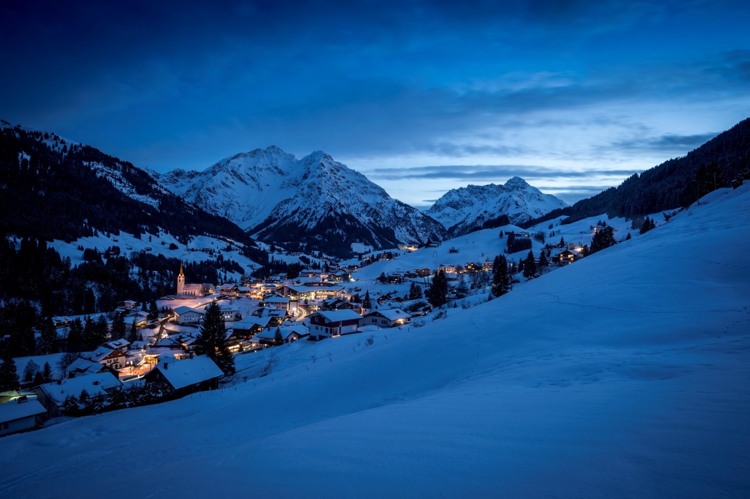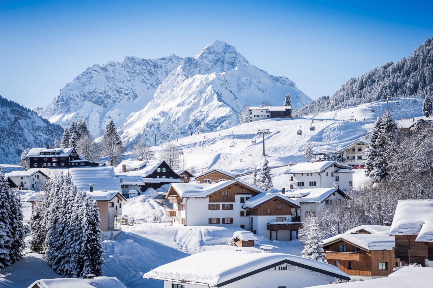 Das Kleinwalsertal genießt den Ruf als „Schneeloch“ und stellt mit vier Skigebieten genügend Auffangfläche für den weißen Powder zur Verfügung. Skifahrer können sich während einer Wintersportwoche fast jeden Tag an einem anderen Berg bewegen und bleiben doch in einem zusammenhängenden Gebiet mit rund 130 Pistenkilometern. Die Skigebiete Kanzelwand-Fellhorn, Ifen und Walmendingerhorn umrahmen das Kleinwalsertal, die Tallifte der Heuberg Arena liegen im Herzen des Tals und starten im Ort Hirschegg. Das Auto können die Skifahrer getrost stehen lassen, die 130 Pistenkilometer lassen sich problemlos von der Haustüre aus erreichen.