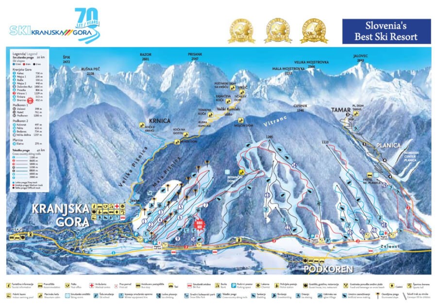 | Größe: | Das Skigebiet Kranjska Gora besteht aus 20,0 Pistenkilometern, davon 10 leichten, 8 mittleren und 2 schweren Pistenkilometern. |