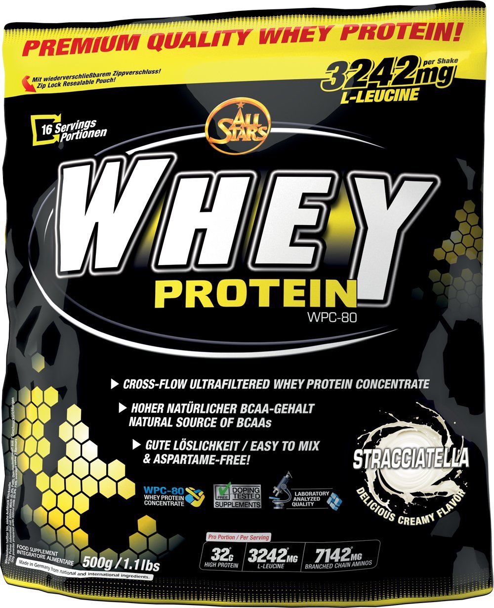 Premium Quality Wheyprotein-Concentrate. All Satrs Whey Protein ist ein hochwertiges Molkeneiweiß-Konzentrat, hergestellt im „Cross-Flow Ultrafiltrations-Verfahren“. Whey Protein verfügt über einen hohen natürlichen BCAA Gehalt non 7142 mg pro Portion, bei nur 3 g Kohlenhydraten und 3 g Fett. Sehr gut löslich, Aspartam-frei.