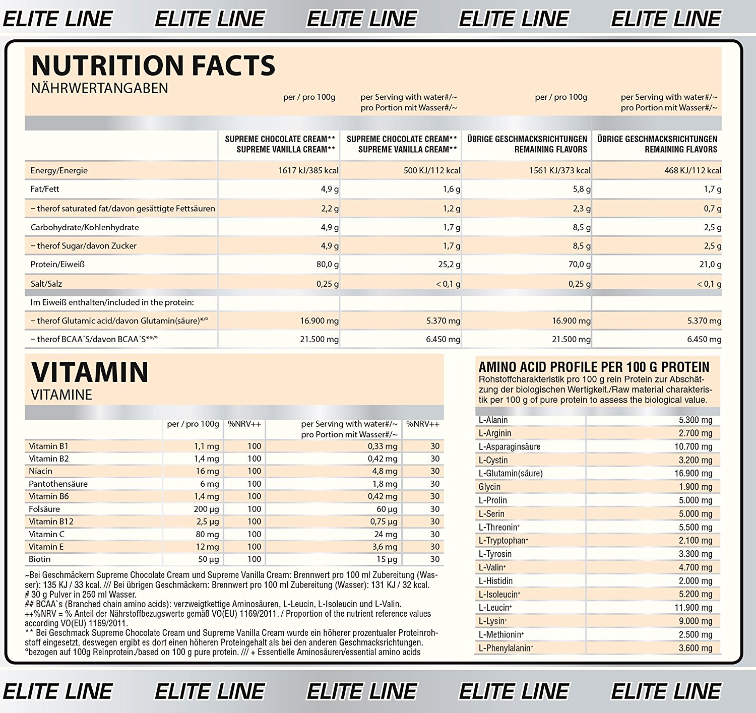 Supreme Whey 100% ist eine hochwertige Eiweißpulverkombination aus Whey Konzentrat und Whey Isolat aus dem Sie sich mit Wasser oder Milch täglich leckere cremige Shakes zur Nahrungsergänzung zubereiten können. Im Produkt werden keine gentechnisch veränderten Rohstoffe eingesetzt. Dies gilt für alle eingesetzten Rohstoffe einschließlich Zusatzstoffen und Aromen. BWG steht für Natürlichkeit, Klarheit und Reinheit. Ein Konzept: Sportnahrung für jeden, der Wert auf körperliche Fitness und gutes Aussehen legt. Mit dem Produkt BWG Supreme Whey 100% erhalten Sie das Versprechen für sorgfältigst ausgewählte Inhaltsstoffe, eine nährstoffschonende Herstellung und höchste Qualität. Das Supreme Whey 100% ist für sie im 500g oder 1000g Beutel (wiederverschließbar) erhältlich und inzwischen gibt es das Produkt auch in einer 2000g Dose für sie. Hinweis zur Proteinwahl: Proteine, die sowohl anabolen Zwecken als auch der Regenerationsförderung dienen, werden heute meist als Proteinkombinationen konzipiert (Mehrkomponenten Proteine). Tierische Proteine werden vorzugsweise verwendet, wenn eine höchstmögliche anabole Wirkung erwünscht wird. Pflanzliche Proteine haben hohe Anteile an Glutamin, Asparaginsäure und Arginin und werden bevorzugt nach intensiven Belastungen eingesetzt. Rein Pflanzliche Proteine bzw. Mehrkomponenten Proteine mit hohem pflanzlichem Proteinanteil und auch reines Eiprotein unterscheiden sich geschmacklich von reinen Milchproteinen wie z.B. Whey Protein.