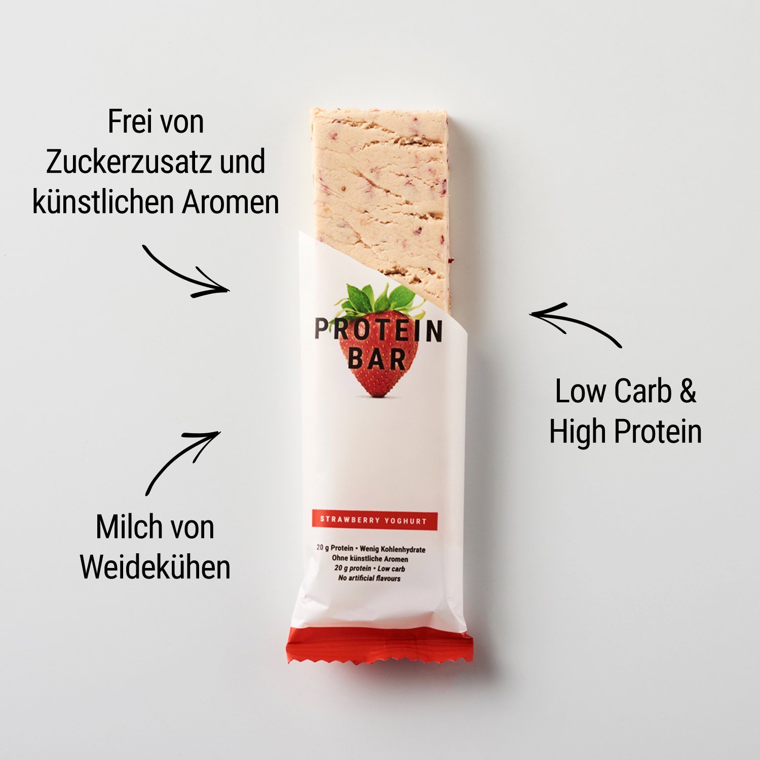 Dank einer speziellen Ballaststoffmischung kommt unser Eiweissriegel komplett ohne zugesetzten Zucker aus