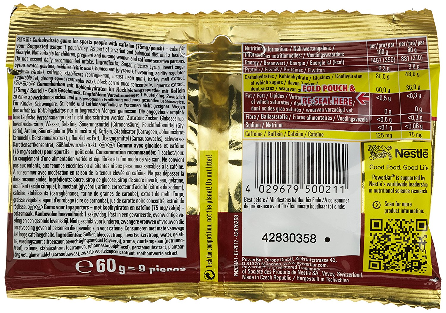 Die leicht zu portionierende Alternative zu PowerGel®. 5 Shots liefern ca. dieselbe Menge an Kohlenhydraten wie 1 PowerGel®. Einzigartiger Geschmack mit fl üssiger Gelfüllung -Cola Geschmack enthält 75 mg Koffein pro Beutel, zur Unterstützung der mentalen Leistungsfähigkeit 1 Box = 16 Beutel