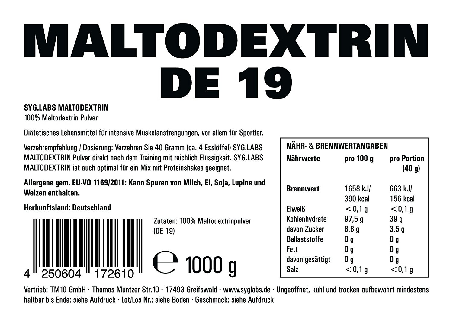 Es kann in verschiedensten Flüssigkeiten, wie z.B. Proteinshakes, Tee oder Schorlen eingemischt werden und ist dabei nahezu geschmacksneutral. Gerade direkt nach dem Training ist eine schnelle Versorgung der Muskeln mit Protein und Aminosäuren sehr wichtig. Unser SygLabs Maltodextrin hat ein Dextrose-Äquivalent von 19 und wird ausschließlich in Deutschland hergestellt. Es eignet sich nicht nur zur Unterstützung des Muskelaufbaus, sondern ebenfalls sehr gut zur effektiven Gewichtszunahme. Das SygLabs Maltodextrin löst sich sehr gut auf und liefert schnell verfügbare Energien. Es ist ein wichtiger Bestandteil vor, während und nach dem Training. Unser Maltodextrin ist nicht nur perfekt für ein Fitness-Workout, es eignet sich ebenso für ein Ausdauertraining und als Ergänzung bei einer kohlenhydratorientierten Ernährung. Das Maltodextrin ist sehr gut verträglich und wird vom Körper schnell verarbeitet und löst dadurch keine Müdigkeit oder Völlegefühle aus. Außerdem sorgt es dafür, dass der Sportler sich bei lang anhaltender Belastung dauerhaft perfekt konzentrieren kann. Eine Portion SygLabs Maltodextrin entspricht 40 g (ca. vier Esslöffel) und enthält 39 g Kohlenhydrate.